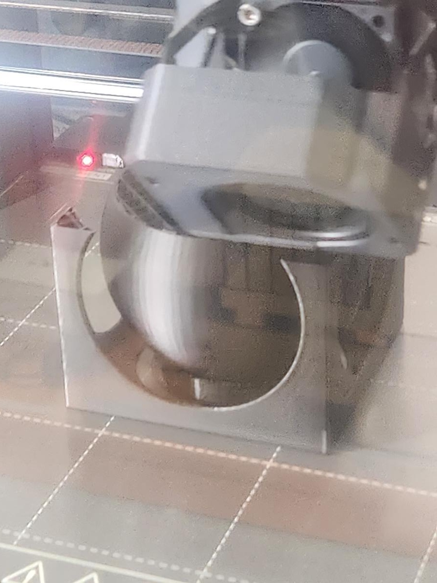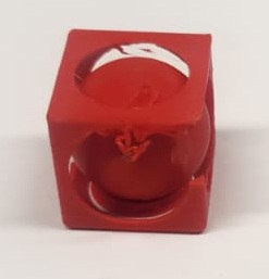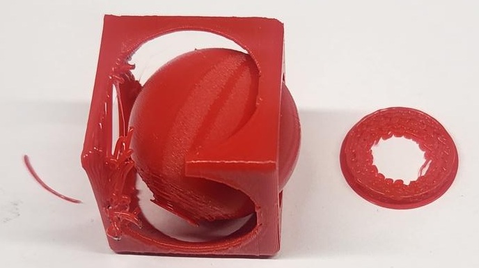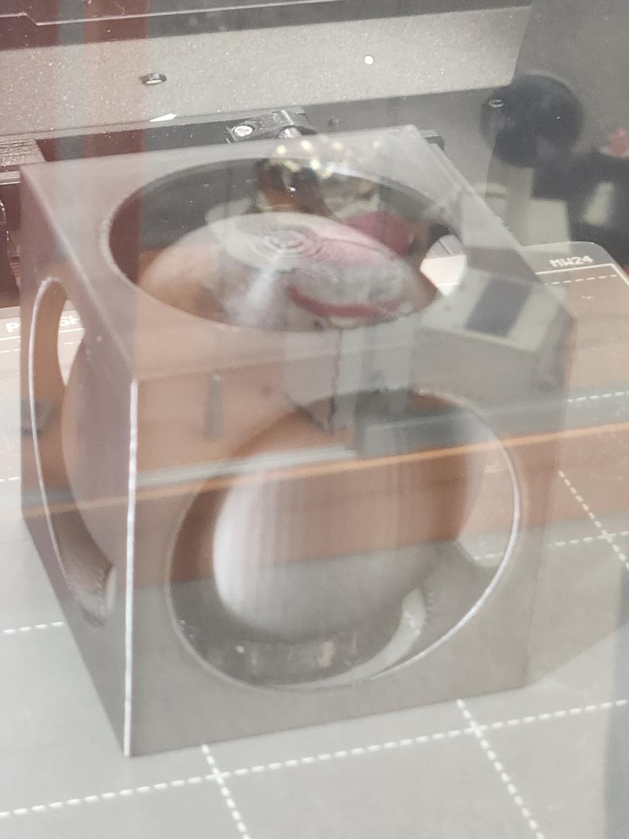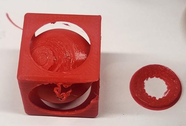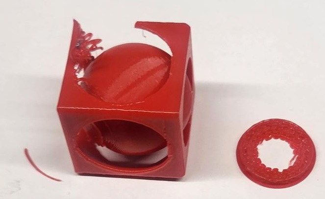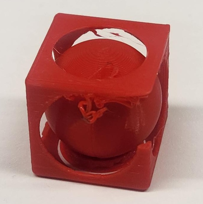 At this reduced scale, the tolerance between the inner sphere and outer cube was no longer sufficient for smooth movement. This demonstrates how scaling directly impacts mechanical clearance, printer resolution limits, and structural stability.
