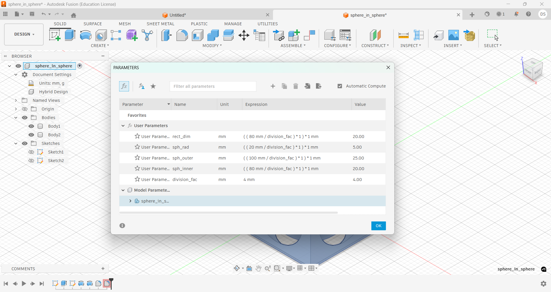 Next, the inner circular profile (Ø80 mm) was revolved around the same axis using the New Body operation. This created the internal sphere body.