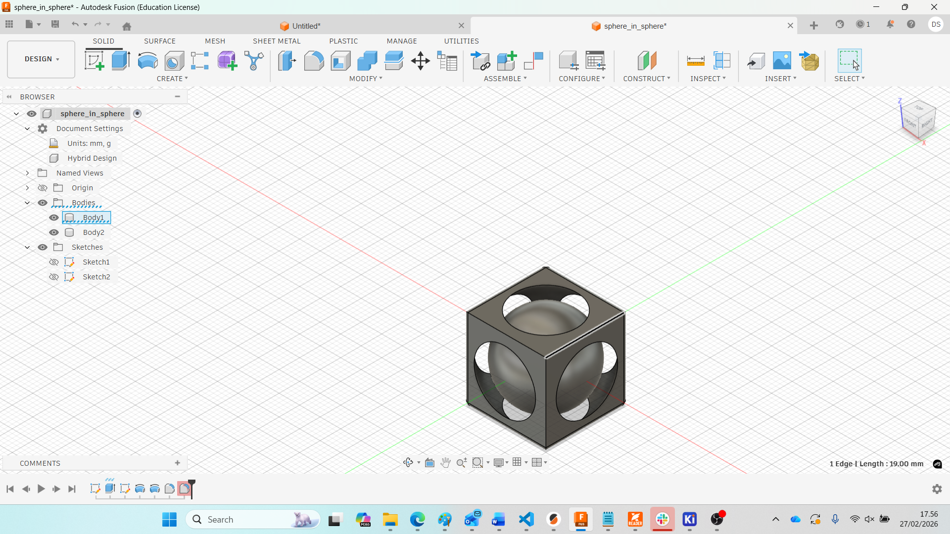 For this week’s assignment, I designed a trapped sphere inside a cube using Autodesk Fusion 360. The objective was to create an object that cannot be manufactured subtractively. The sphere is fully enclosed inside the cube but remains free to move after printing.
