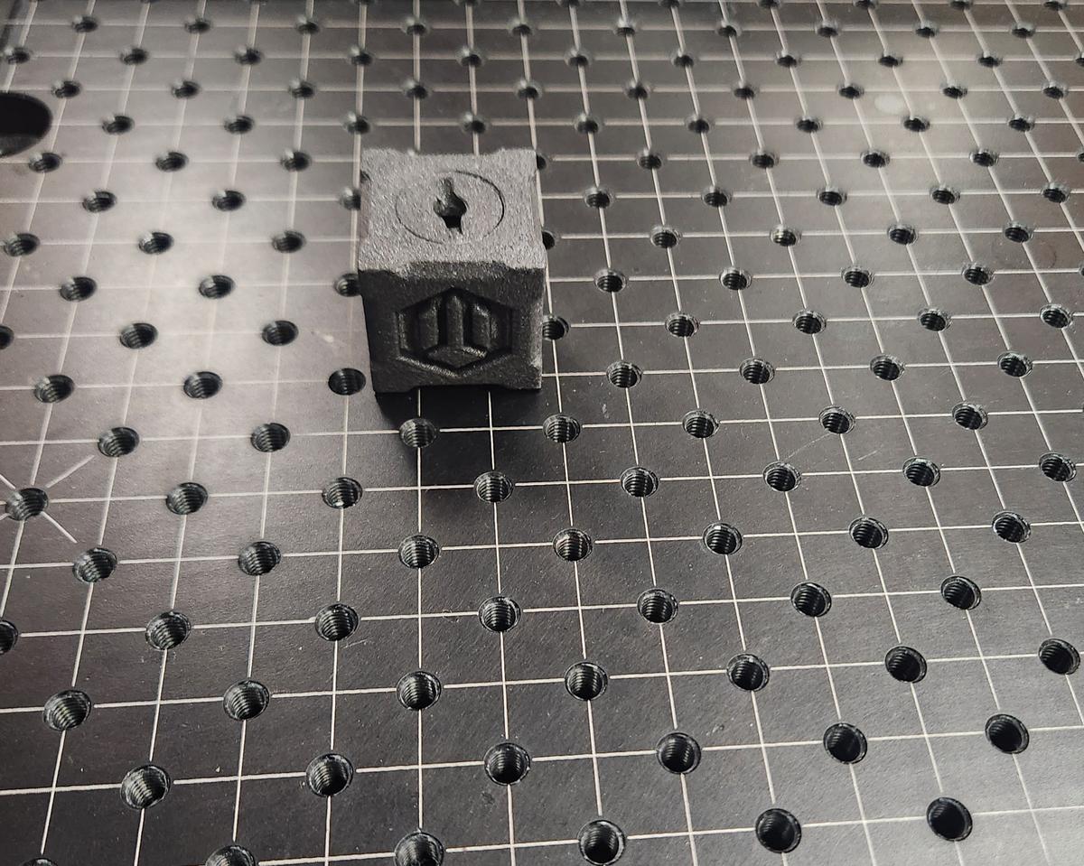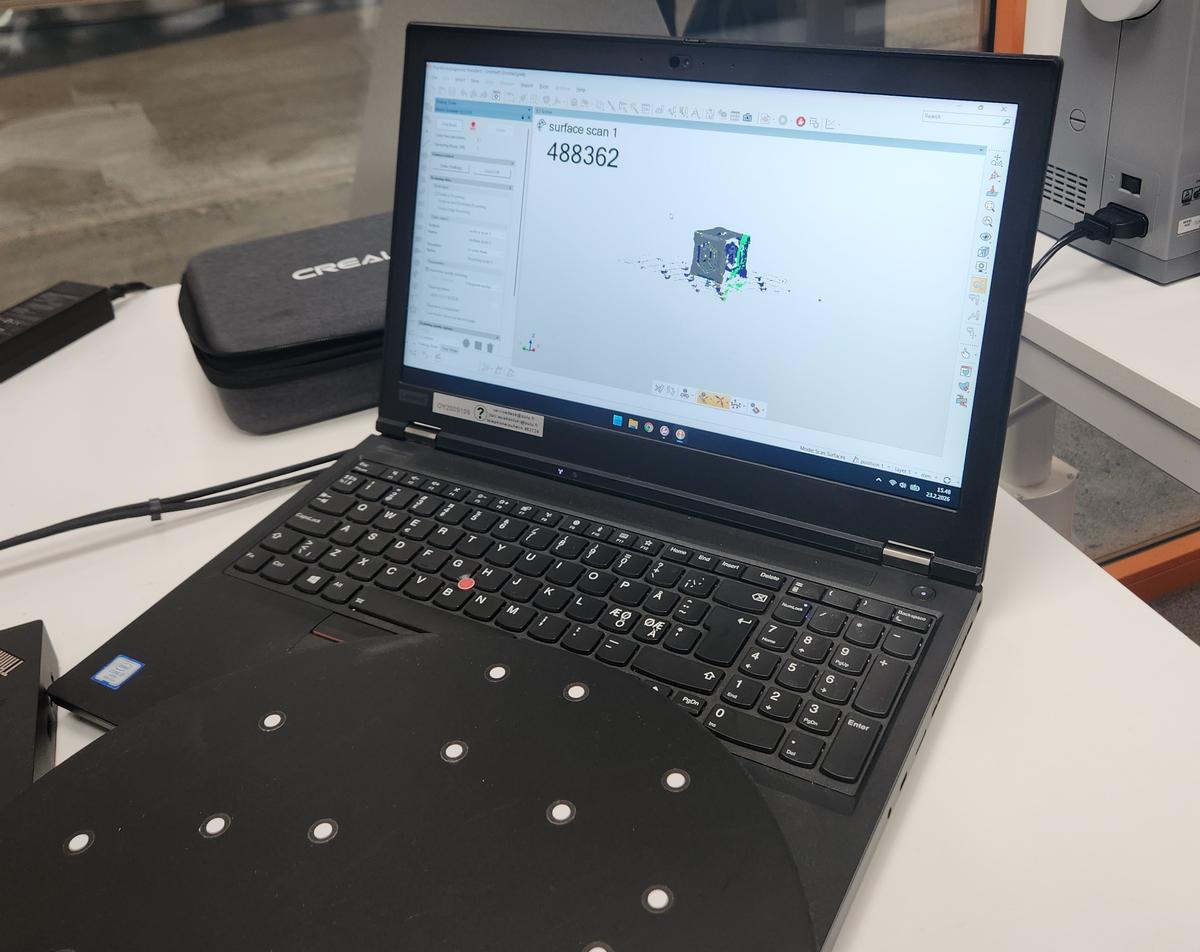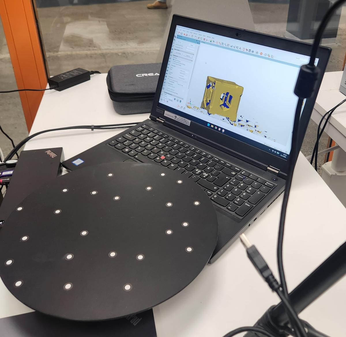 The first object we scanned was a small 3D printed cube. It was placed on the rotating platform to allow full 360° capture.