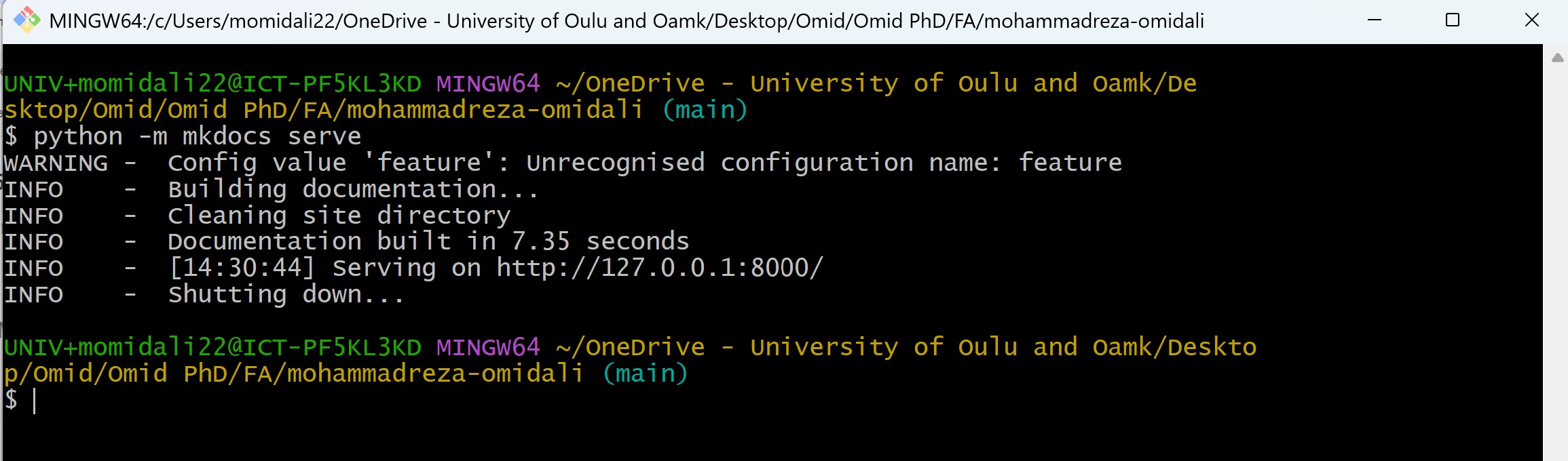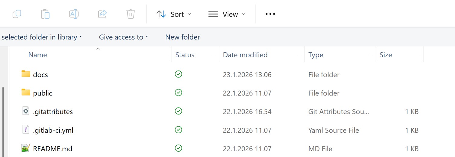 On 22 January 2026, we had a productive two hour class with Ivan, who suggested using Git Bash instead of PowerShell. He also recommended cloning the GitLab repository using SSH, as SSH provides a more secure authentication method based on key pairs. This approach enables seamless, password-less access when pushing and pulling changes between the local and remote repositories during the Fab Academy course. So, I deleted my local repository and cloned it again using SSH. Since I had no prior experience with Git Bash, I spent sometimes after class practicing with it to become more familiar. My local repository after installing MkDocs, which I will explain later: