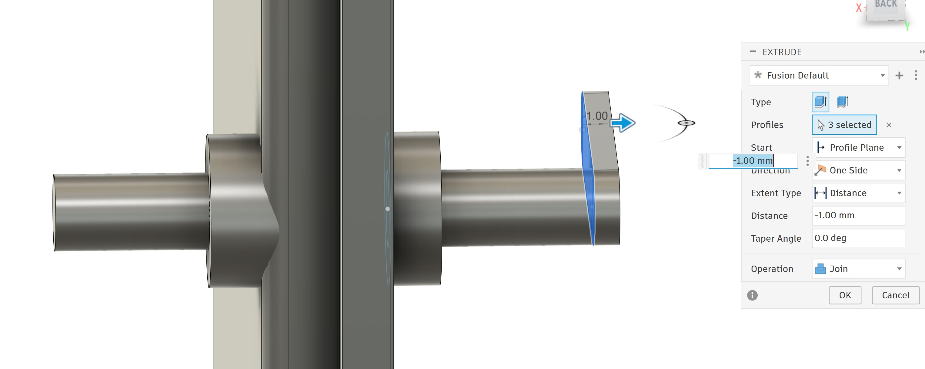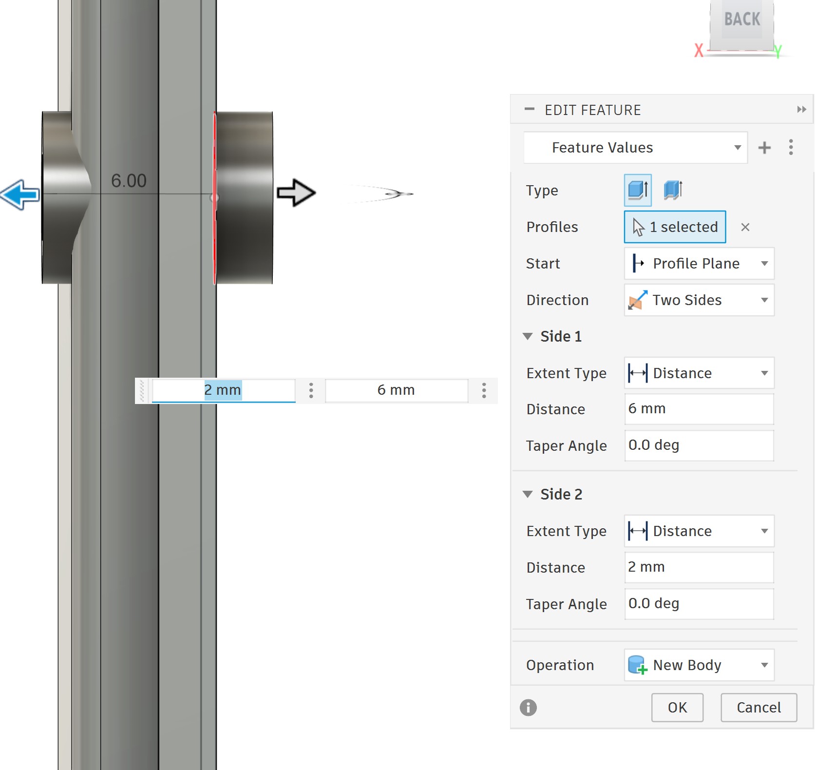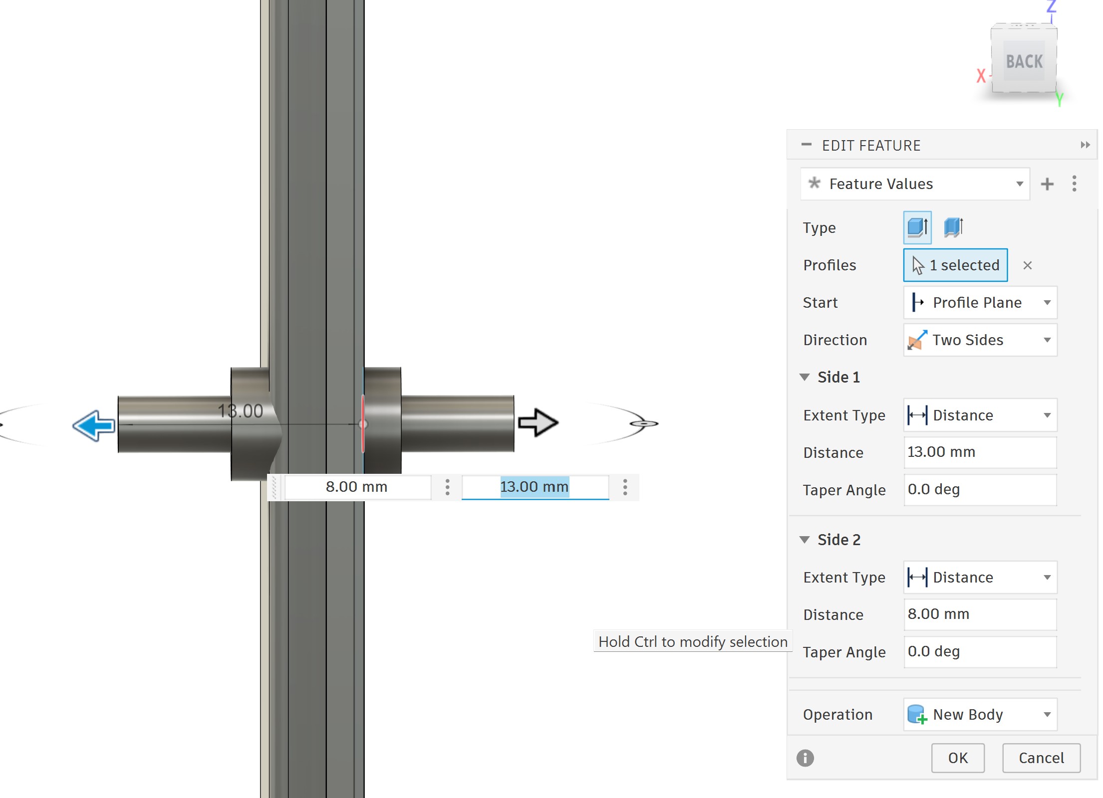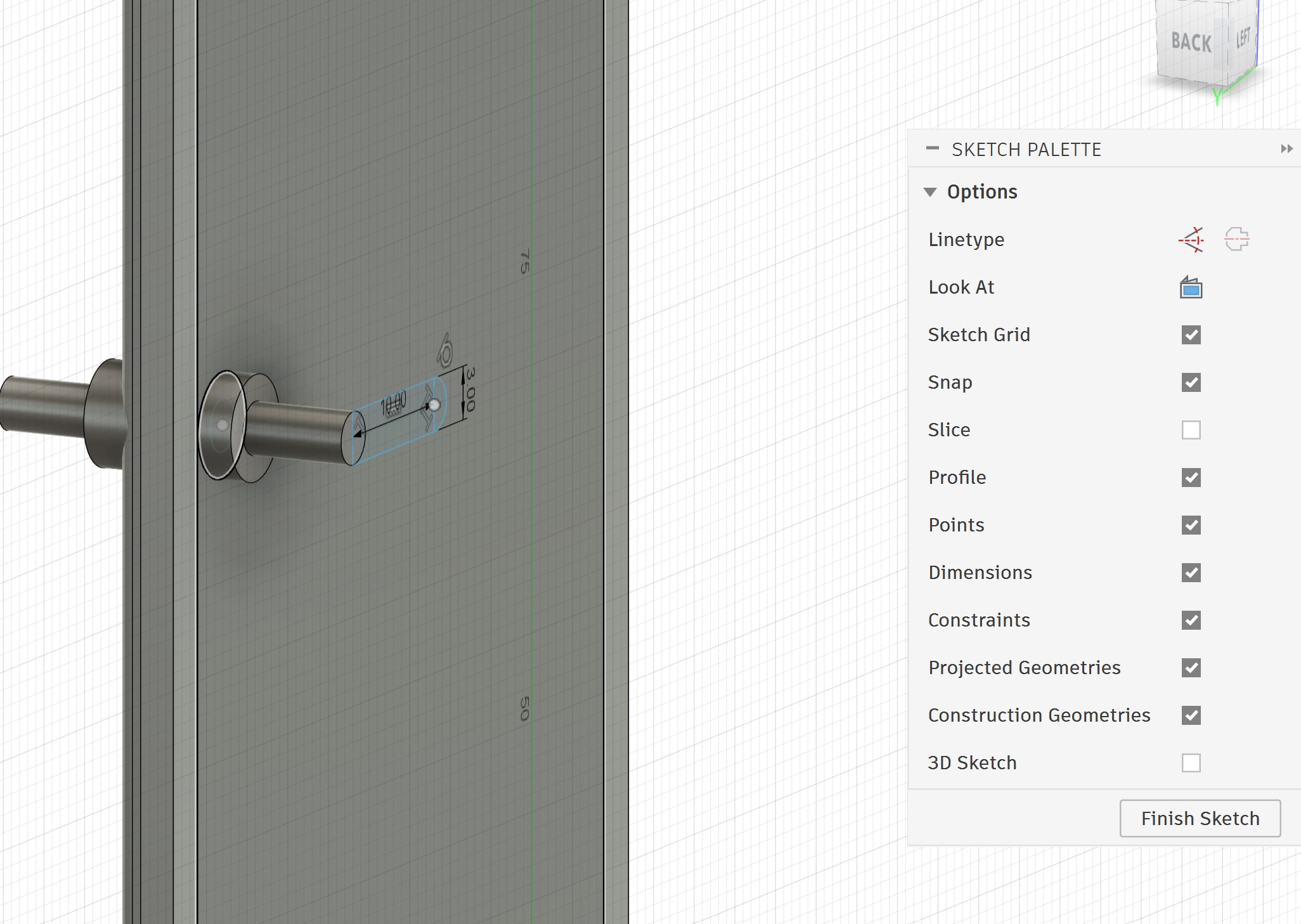 Next, I sketched the handle core and extruded it to both sides: