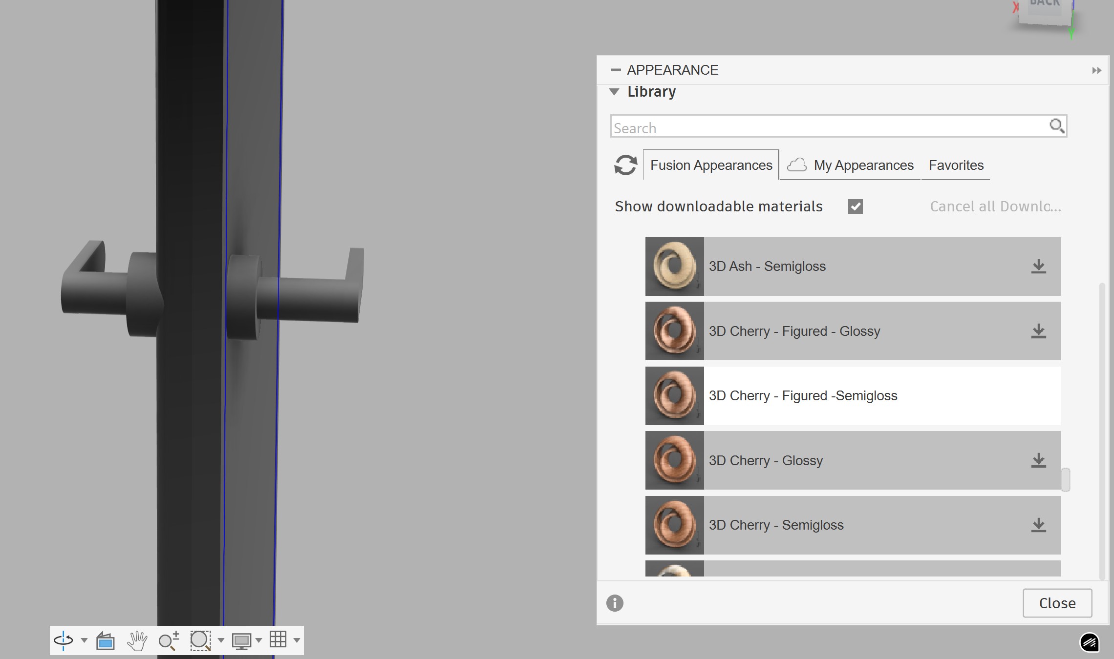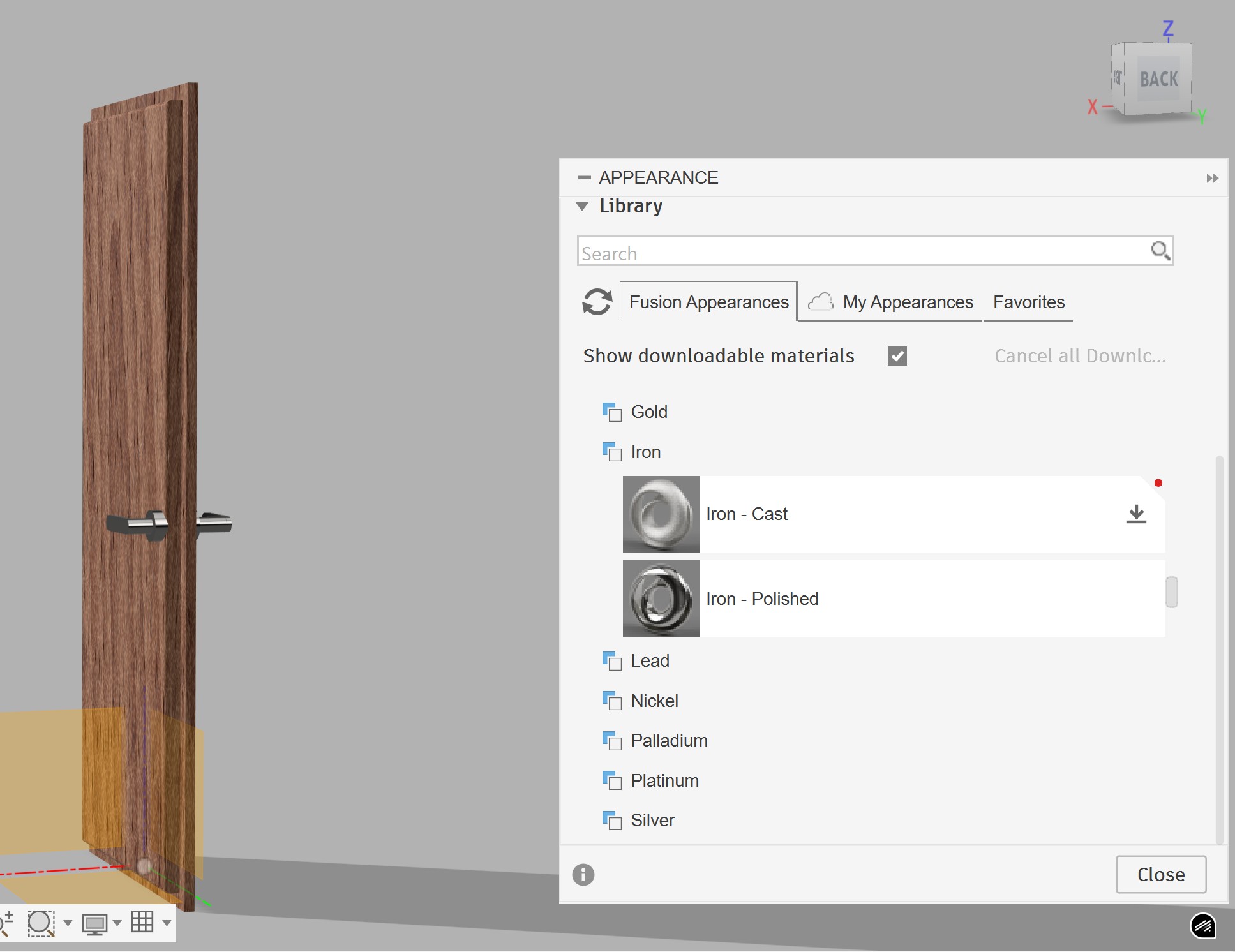 Using the Appearance library, I applied different wood materials to the door body and aluminum to the handle. It was interesting to see how realistic the design looked: