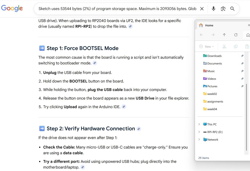 For this week EMbedded programming, I installed and set up Arduino IDE, Thonny-mMcropython. I explain how it went. Hardware for this week: - Board: XIAO RP2040 - Processor: Dual-core RP2040 - Clock: up to 133 MHz - Memory: 264KB of SRAM, and 2MB of on-board Flash memory - Port: COM5 (might be different) - Programming interface: Arduino IDE & Thonny-Mcropython - Connection: USB-C cable (be sure that it is not just charger)
