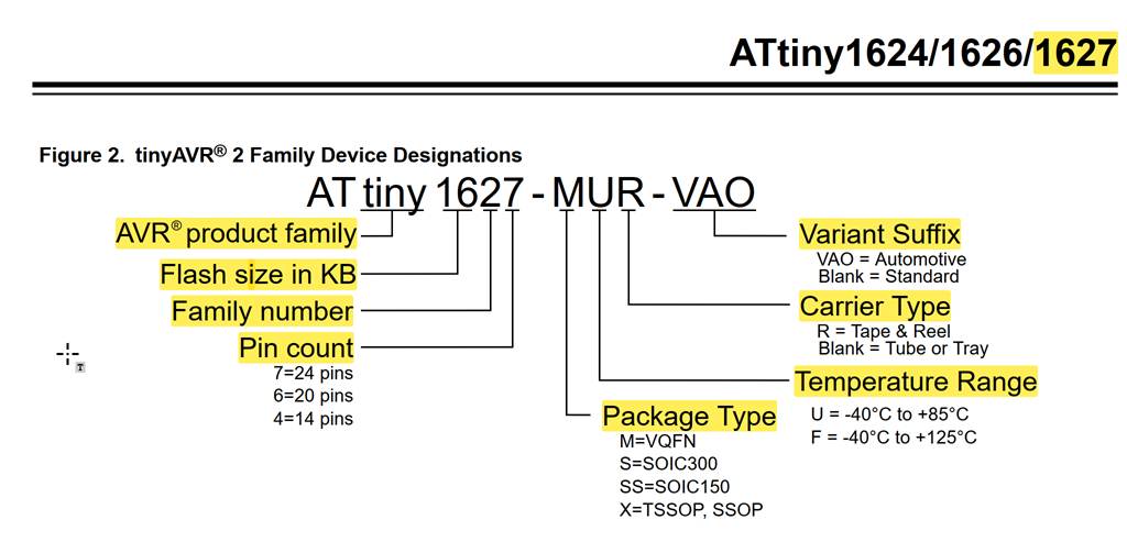 The name of a device in the tinyAVR® 2 family is decoded as follows: