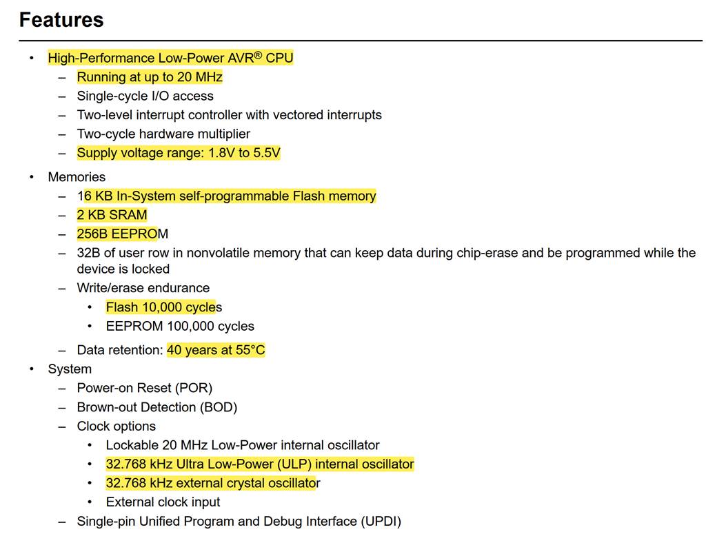 I check the Peripherals and Architecture part: 8-bit AVR (tinyAVR 2-series). Some information related to watchdog timer; The Watchdog Timer (WDT) is a system function for monitoring the correct program operation. When enabled, the WDT is a constantly running timer with a configurable time-out period. If the WDT is not reset within the time-out period, it will issue a system Reset. ADC of this microcontroller: The Analog-to-Digital Converter (ADC) peripheral is a 12-bit differential and single-ended ADC, with a Programmable Gain Amplifier (PGA), and a conversion rate up to 375 ksps at 12-bit resolution.