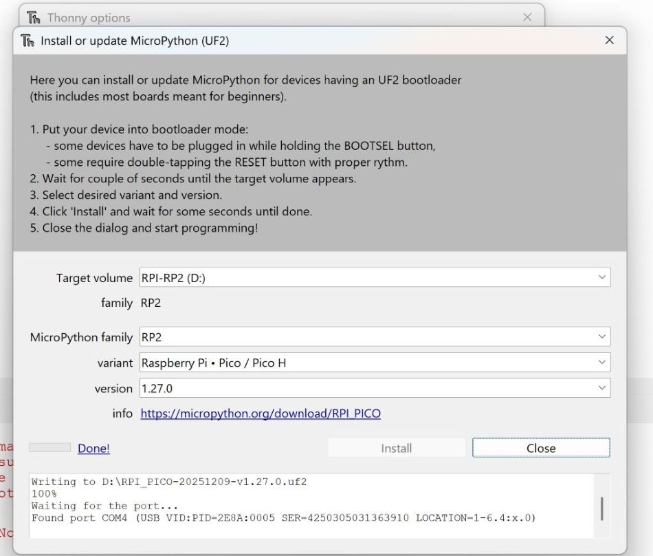 Here in the following steps I briefly mention what I did. Connect the RP2040 and install and updating micropython: