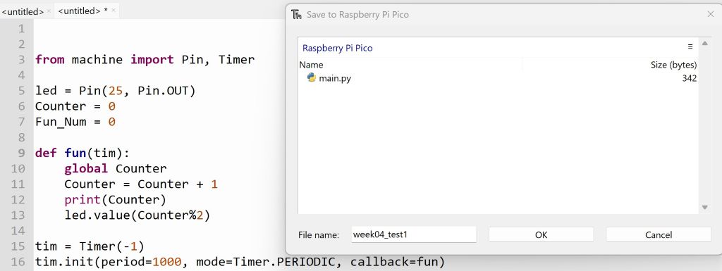 Then I copy paste the first program from the webpage which I already linked it, and save it on the microcontroller. the first program was LED blinking. I changed the delay time from 1 second to 200 ms.