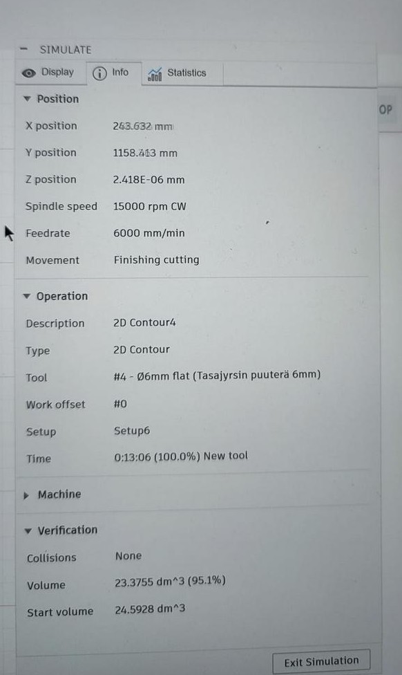 I generated two G-code files in Fusion 360. For cutting, I started with the pocket operation, and before that I ran the simulation again to double-check everything: