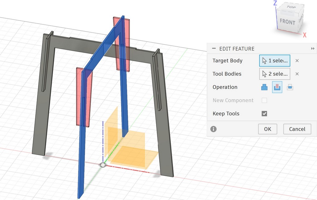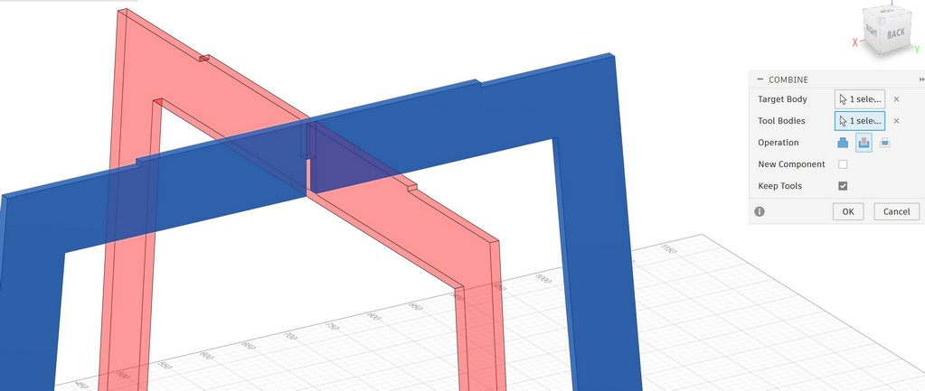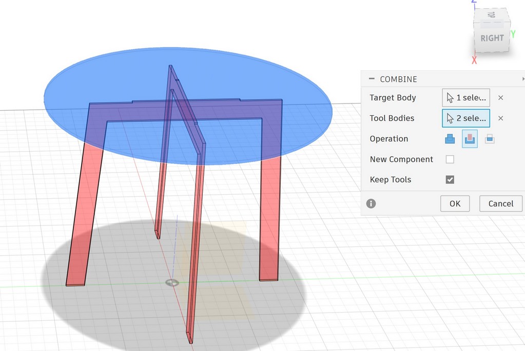 Now I have crossed two legs, I want to make a pocket inside the tabletop using combine tool: