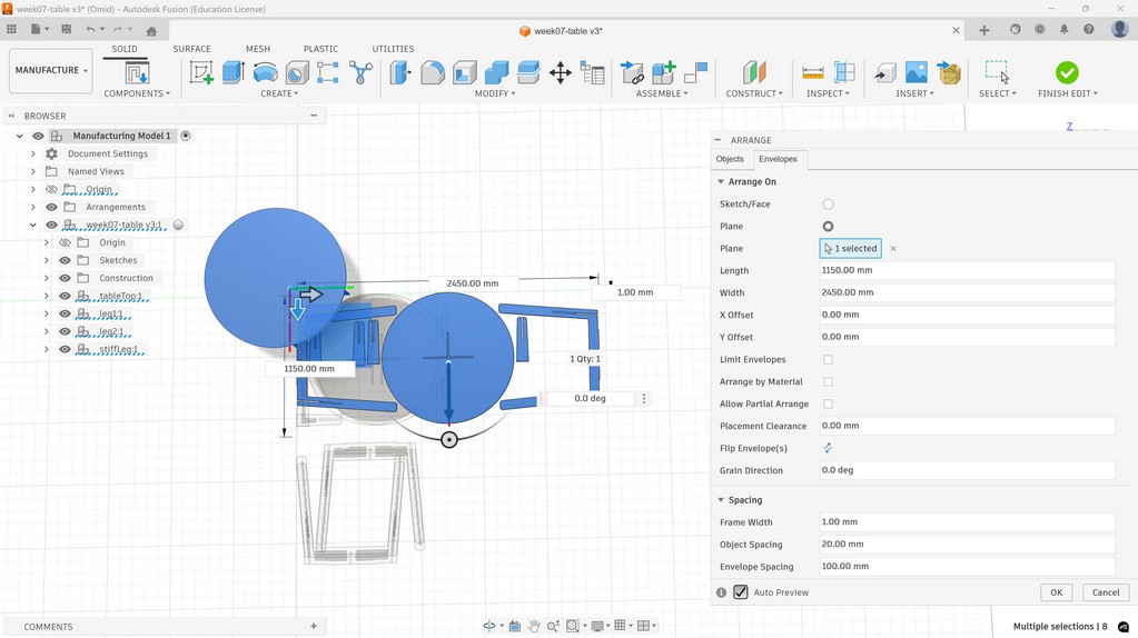 Then arrange the bodies. First select all the bodies and choose the plan (XY), check the length (X-axis) and width (Y-axis) dimensions for the machine: