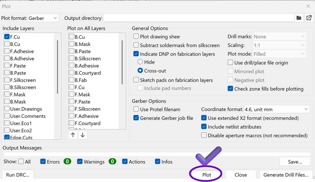 In the Plot window that opened, I selected F.Cu and Edge.Cuts under "Include Layers" and clicked Plot.