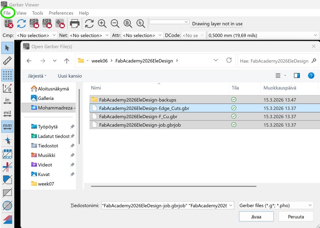 First things first, I needed to prepare the files for the LPKF PCB milling machine. Antti taught us the process during the group work, and I repeated it for my own board as practice.