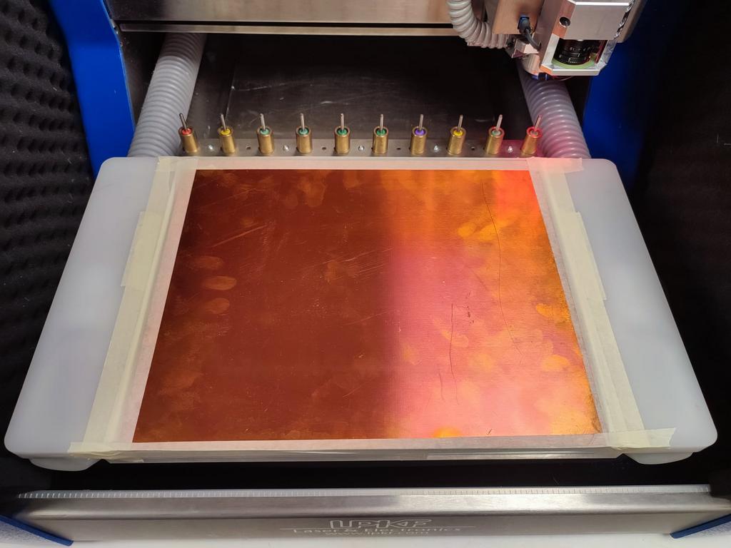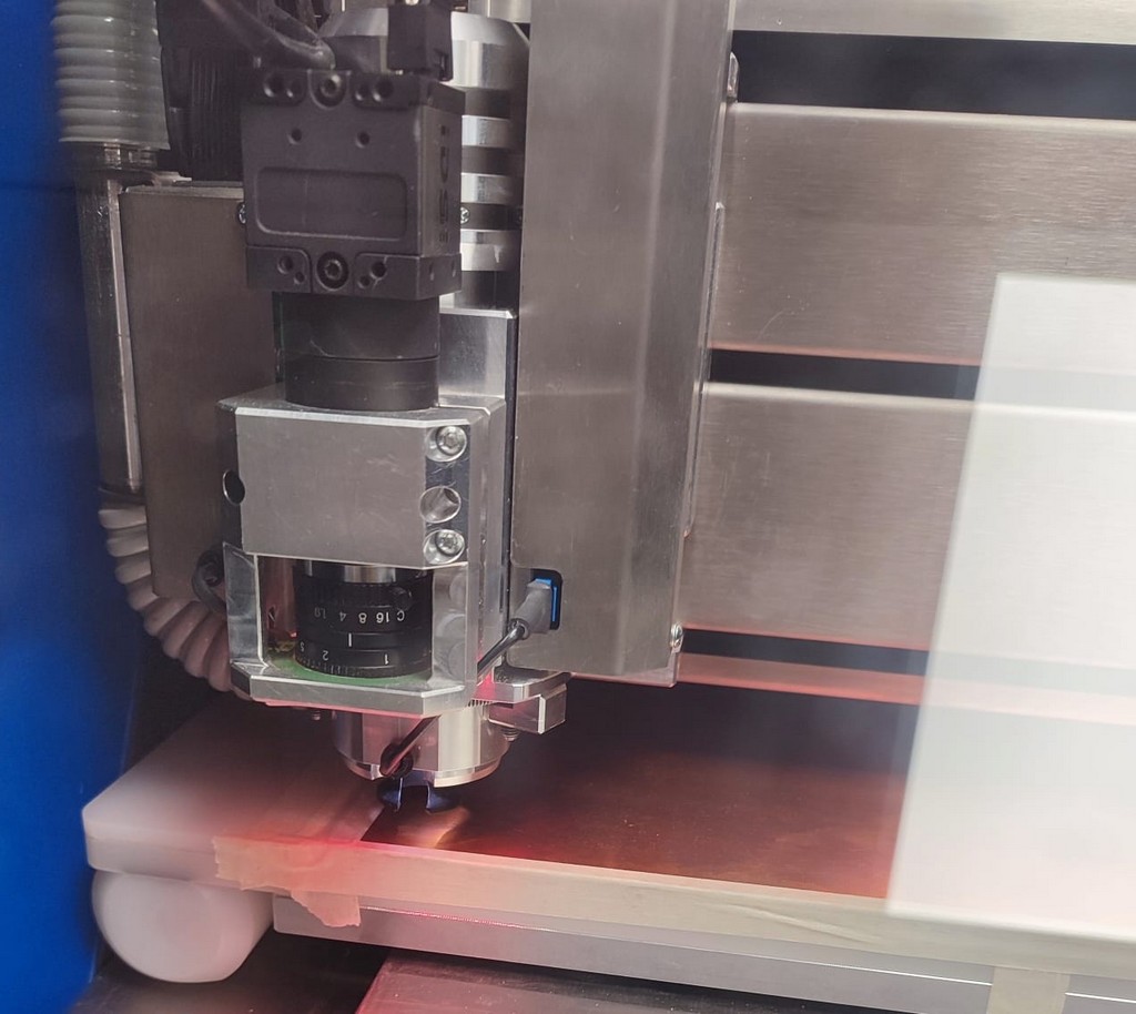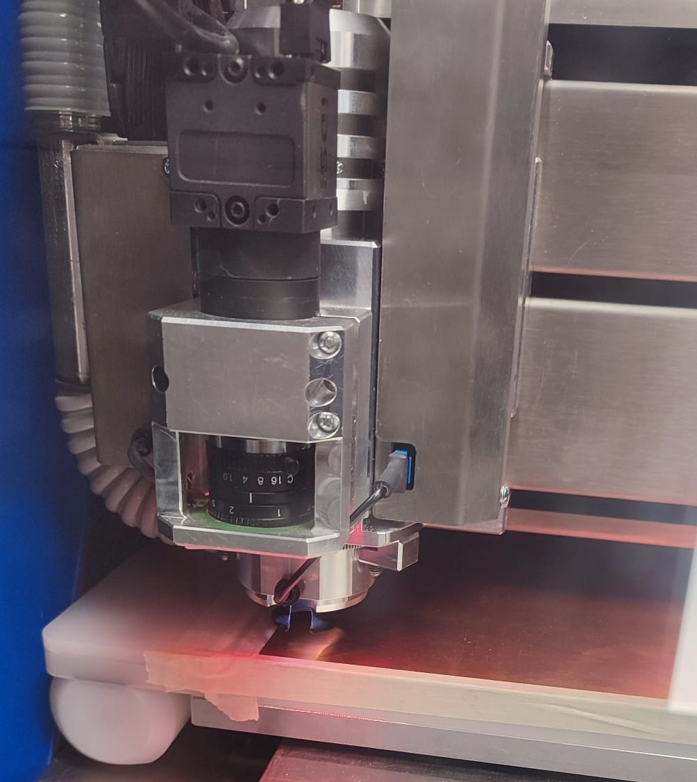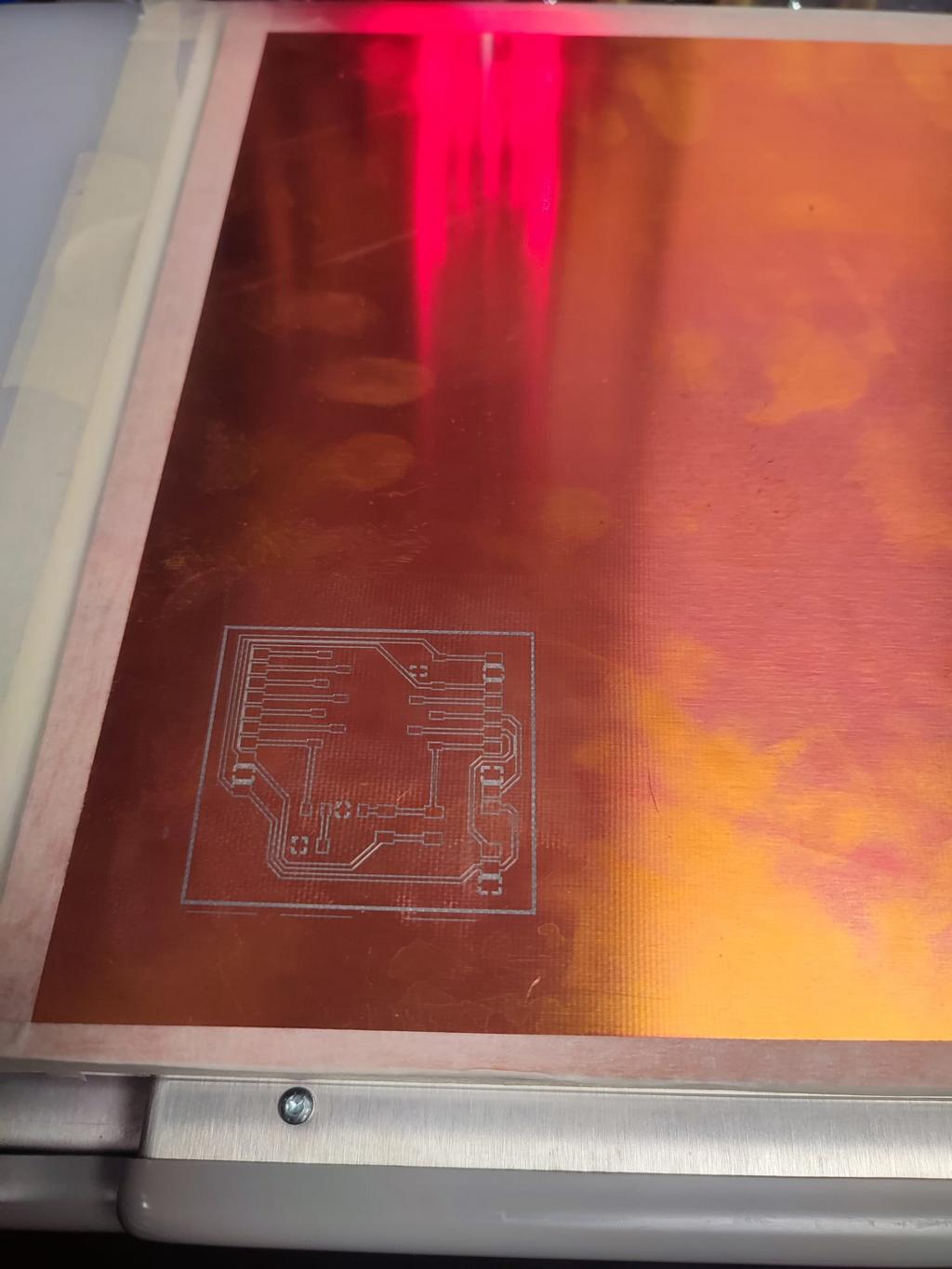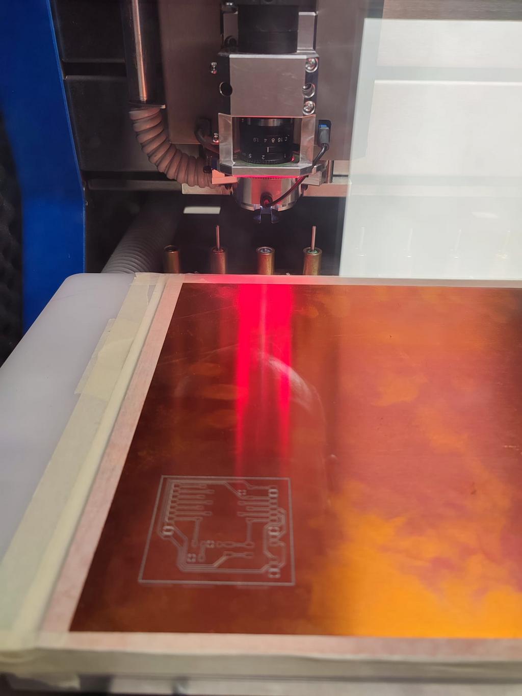 I used the milling method to produce my PCB. I placed the FR4 board inside the machine and taped it down to prevent any movement. The machine also uses vacuum hold-down during milling.