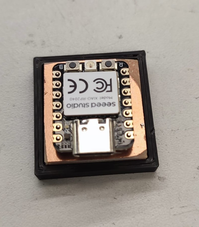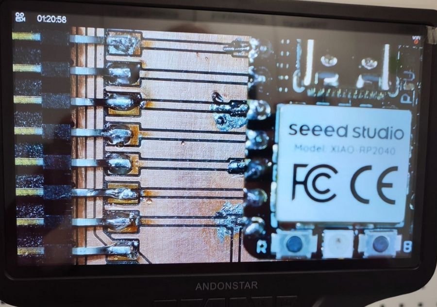 The most difficult component was the microcontroller's pins aligning. Thanks to Antti, this step became much easier: he made an alignment stand that held the Seeed XIAO perfectly in place for soldering the pins.