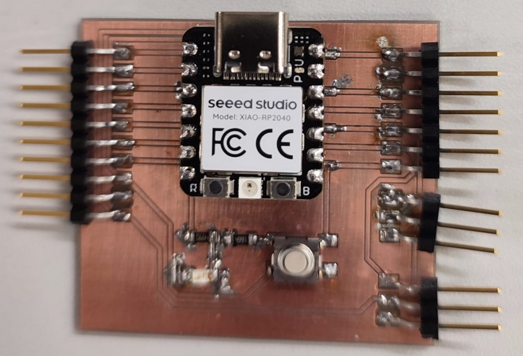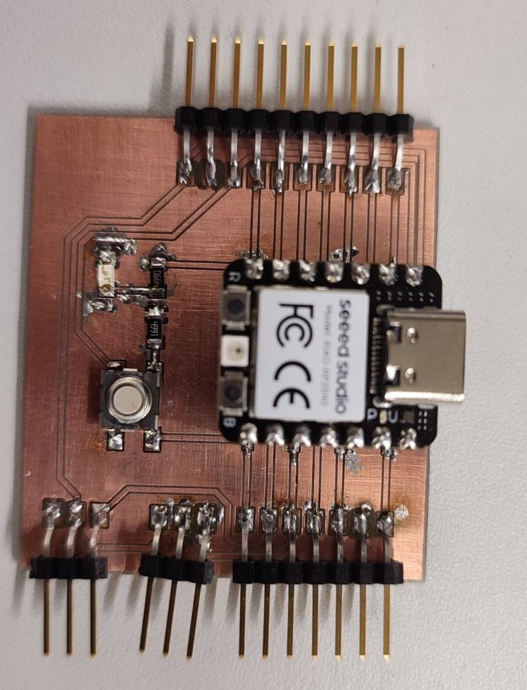 For the individual assignment, I fabricated and tested the board I designed in Week 06. It features a Seeed XIAO module, an LED for output, a push button for input, 0.5 mm traces, a ground plane, and connectors. I milled the board on the LPKF machine, soldered the components, and verified basic functionality.