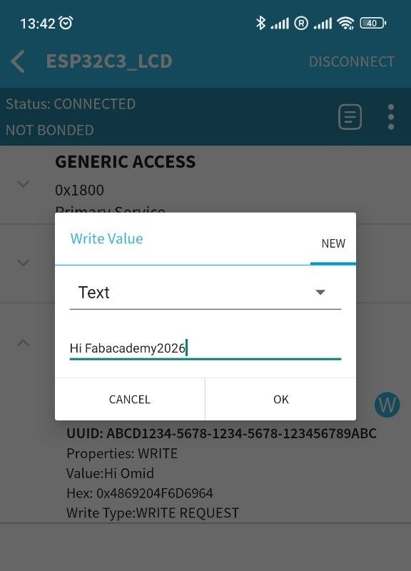 For this week individual assignment I started with controlling a LCD with my phone thru Wifi and Bluetooth.
