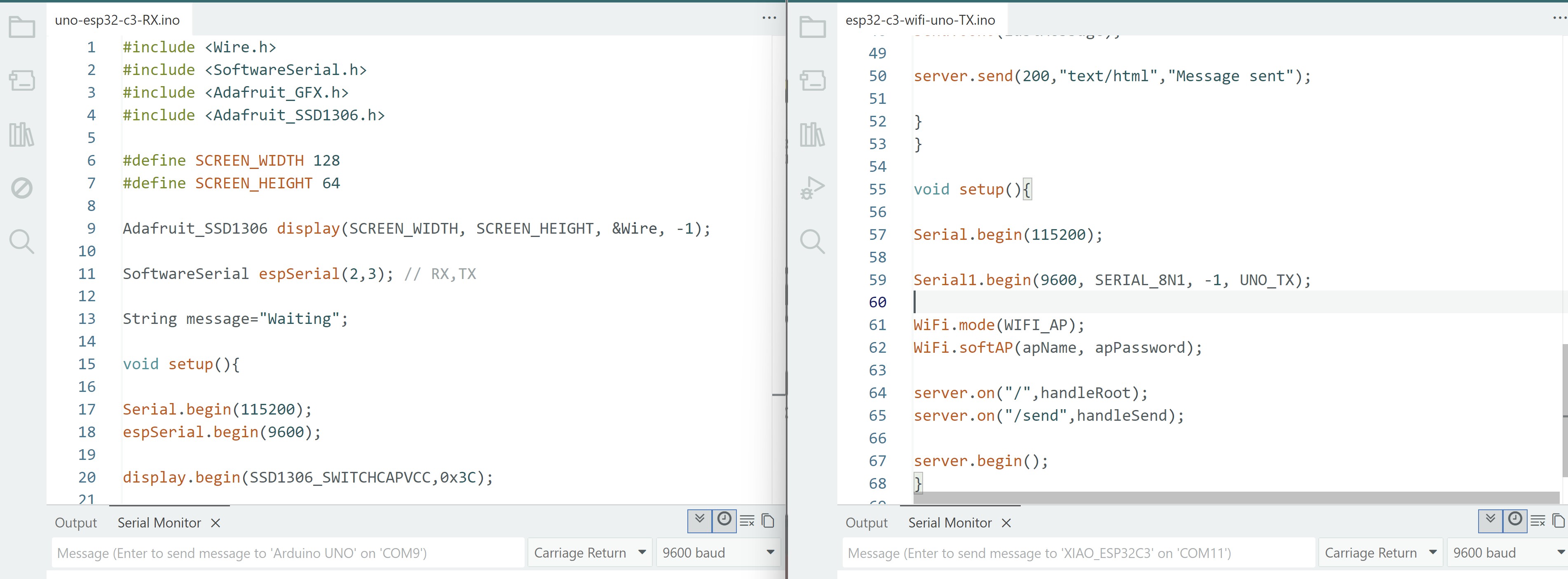 I want to use esp32-c3 and send a message to arduino uno r3 and display it on oled. one more thing I want to send the message from my phone via wifi to ESP32 and... modify this code: