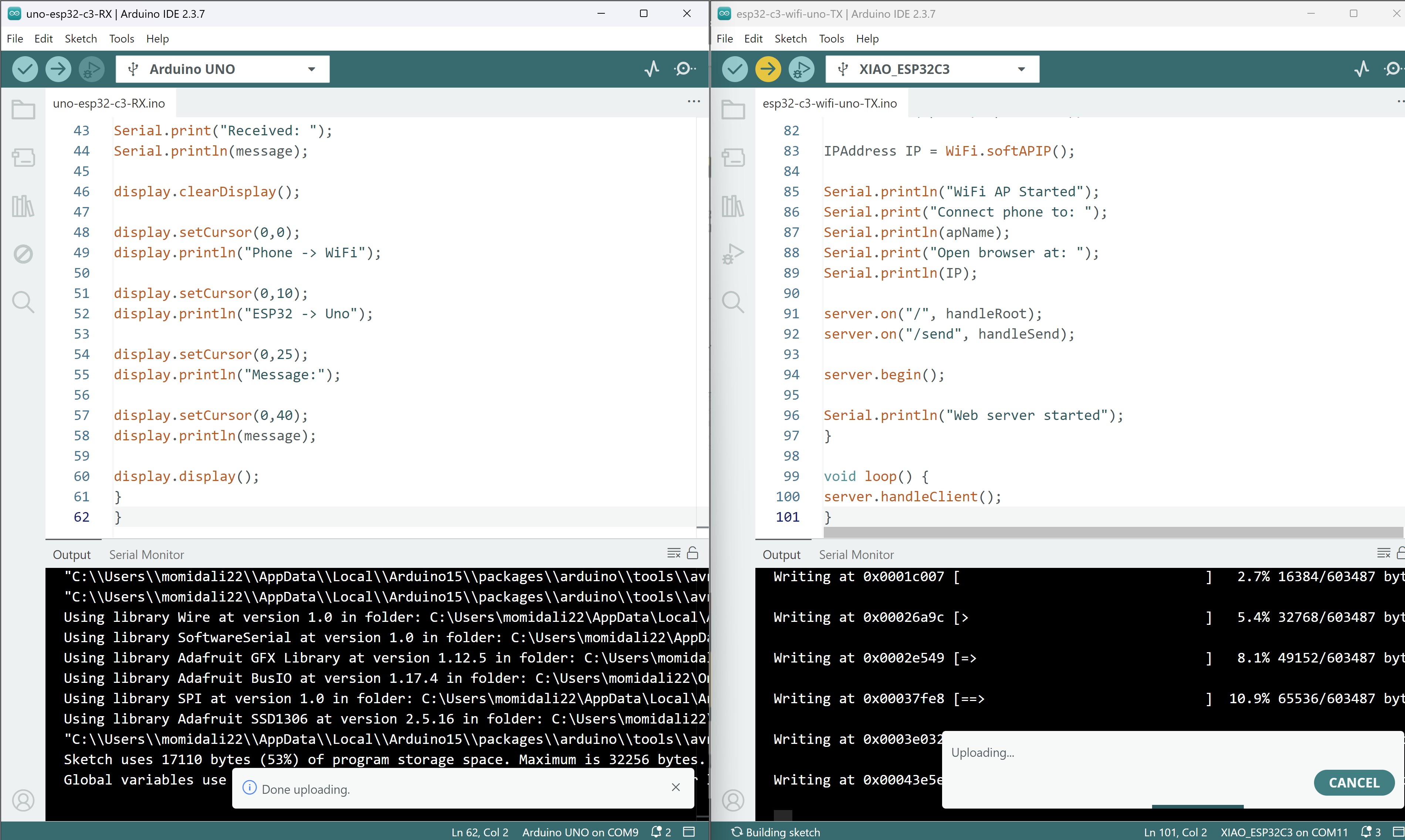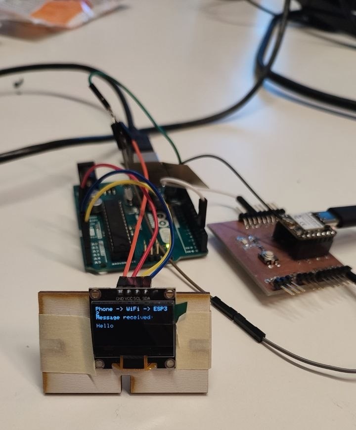 In this setup, the ESP32-C3 acts as a Wi-Fi access point and receives messages from the phone. The ESP32-C3 then forwards the message through UART serial communication to the Arduino Uno. Finally, the Arduino processes the received message and displays it on the OLED screen using the I²C interface.