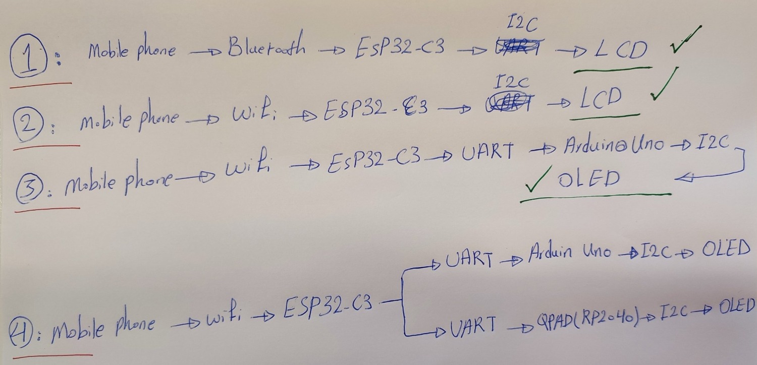 In the second test, I added another node (Arduino Uno) to the ESP32-C3. I connected an OLED display to the Arduino Uno and controlled it from my phone using Wifi, with the ESP32-C3 acting as the main node.