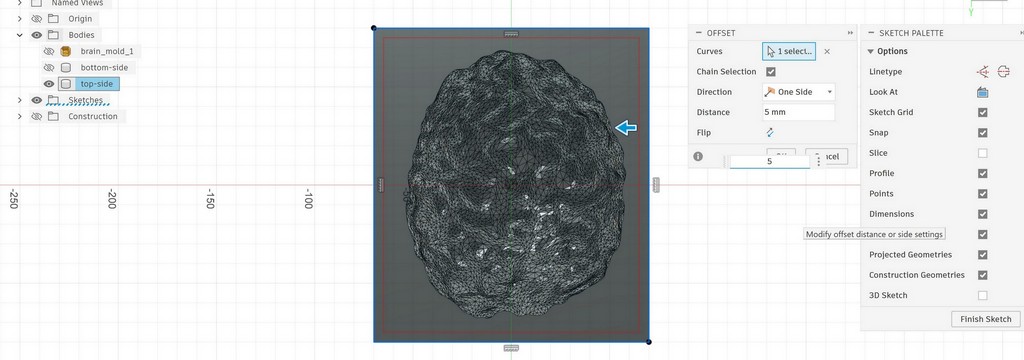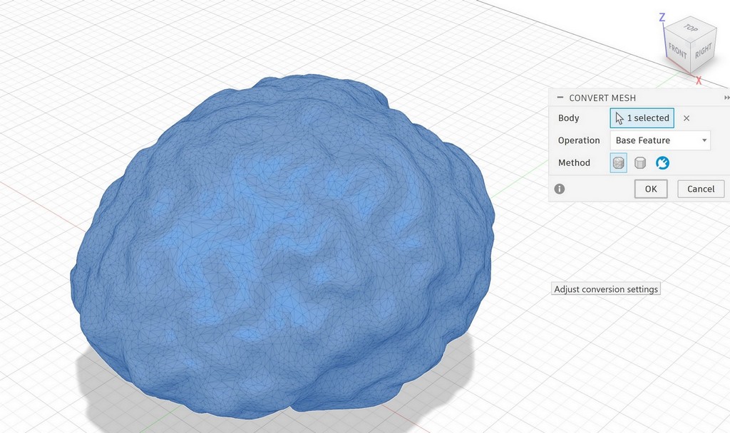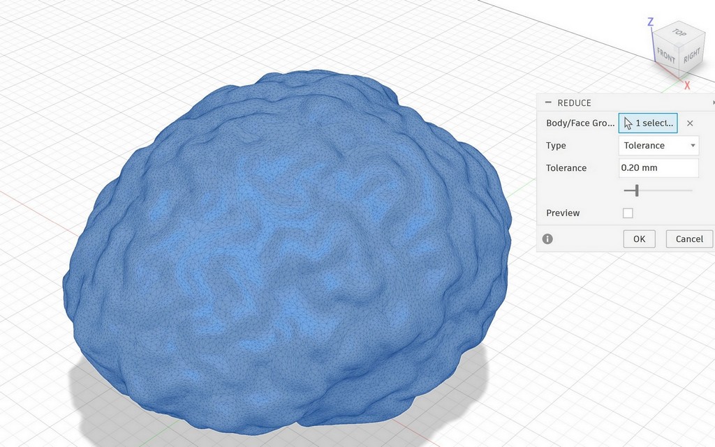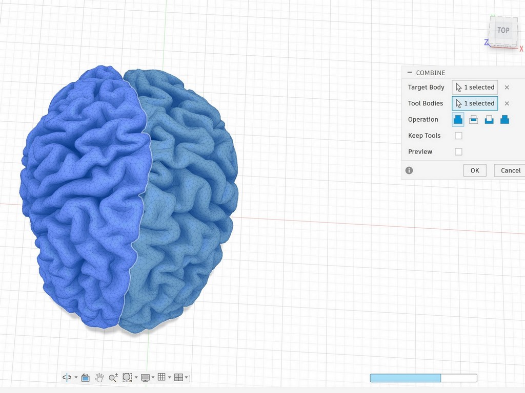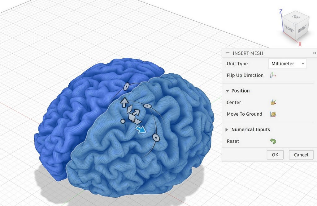 I downloaded the brain STL 3D model and inserted both the left and right hemispheres into Fusion 360 as mesh models: