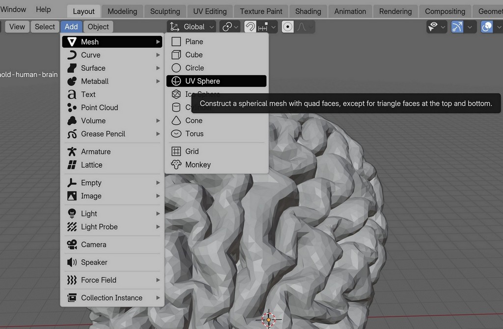 I got the 3D model from BigBrain Project, which provides a very detailed 3D model of the human brain. Scientists scanned a real brain in very thin slices and reconstructed it digitally, image reference.