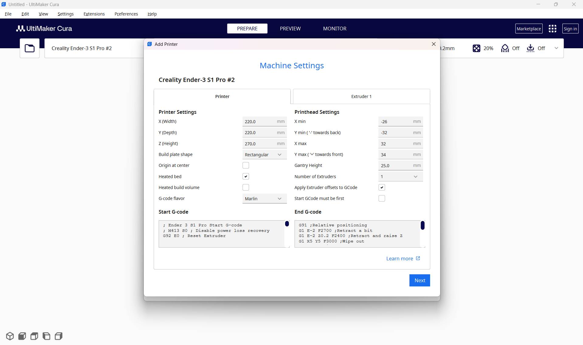 | Creality Ender-3 S1 Pro | Cartesian (bed-slinger) | 220 × 220 × 270 | 220 × 220 | 270 | 13.07 | 490 × 455 × 625 | 8.6 | 0.05 – 0.40 | 1.75 | 0.4 mm |