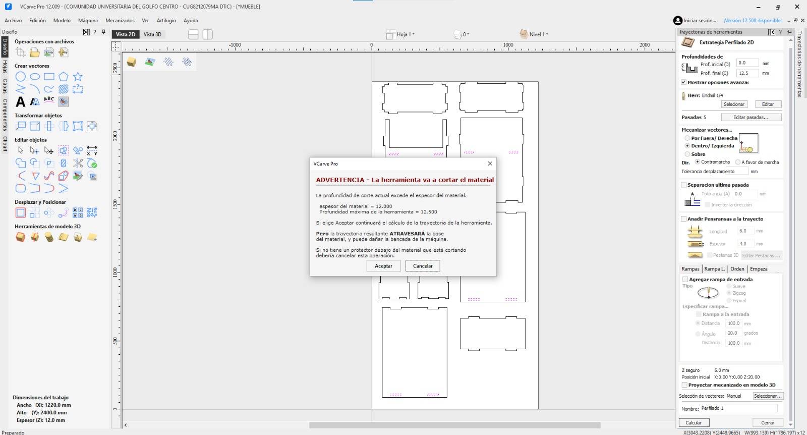 A warning will appear regarding cutting through the material. This is expected, click OK.