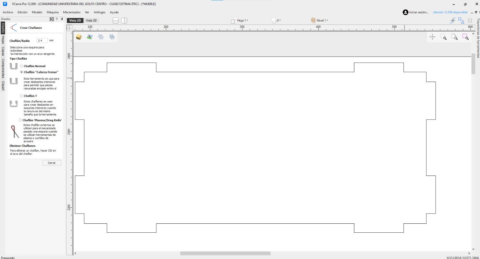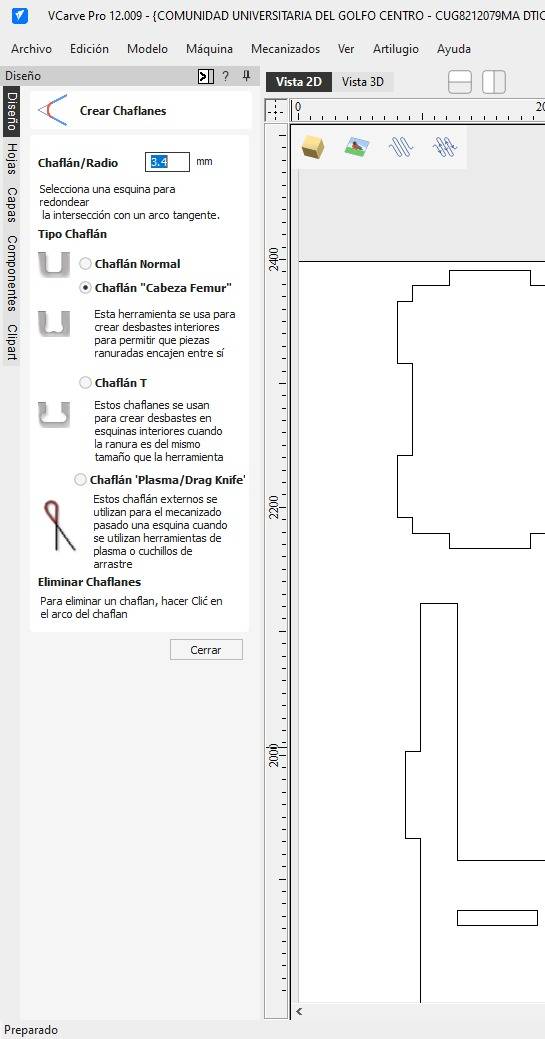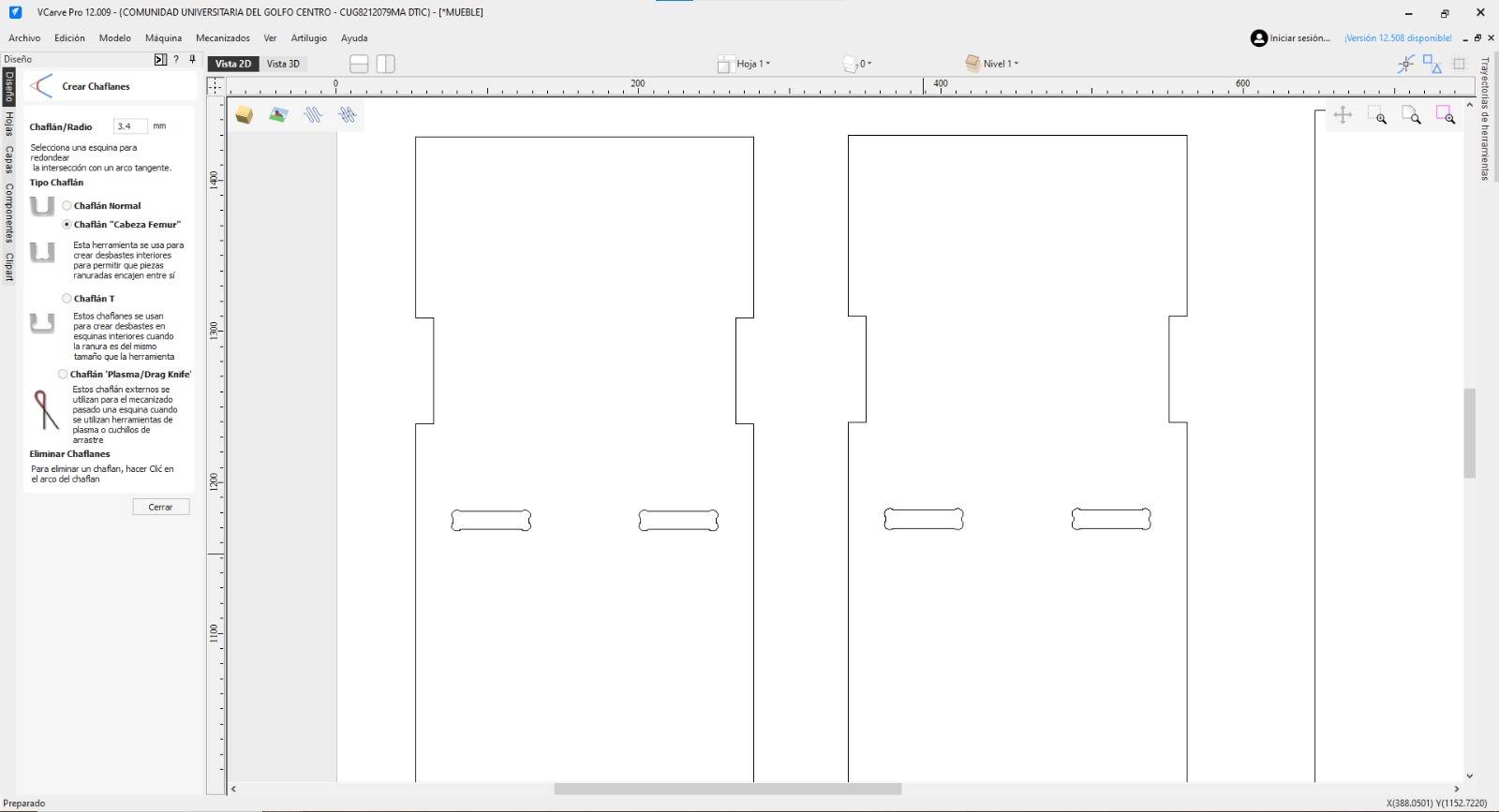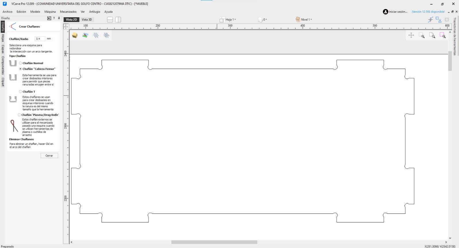 Now we simulate the exterior. Select all part contours. Since CNC bits are round, they cannot cut perfectly sharp 90° internal corners; they always leave a radius. Dog-bones create a small circular relief in the corners, allowing rectangular "tabs" or joints from other pieces to fit flush and lock together perfectly without manual sanding.