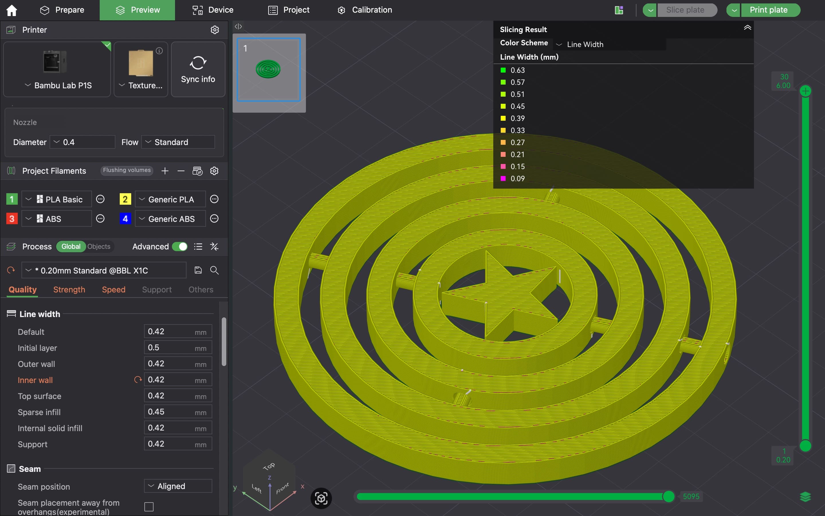 A 0.4 mm nozzle was used, with a consistent 0.42 mm line width applied to walls to ensure uniform extrusion and improved dimensional reliability.