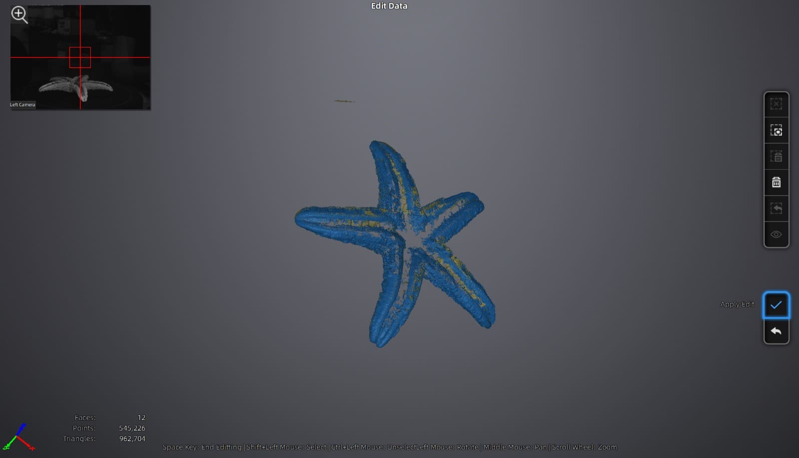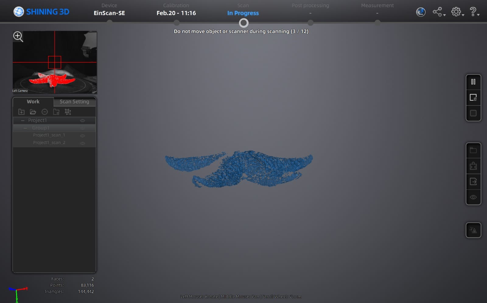 During the scanning, the system captured multiple frames (12 steps) while the turntable rotated. At this stage, we could see how the starfish shape was forming.