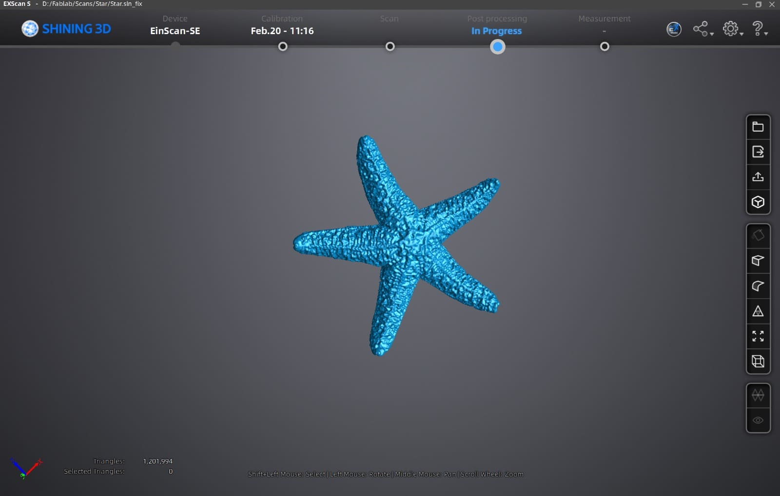 I performed a 3D scan of a starfish using the EinScan-SE scanner. The objective was to understand the complete scanning workflow: from scan configuration to mesh processing.