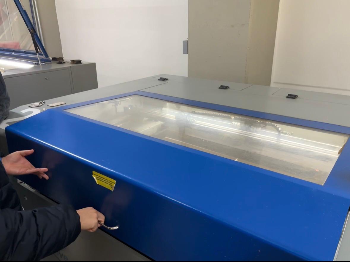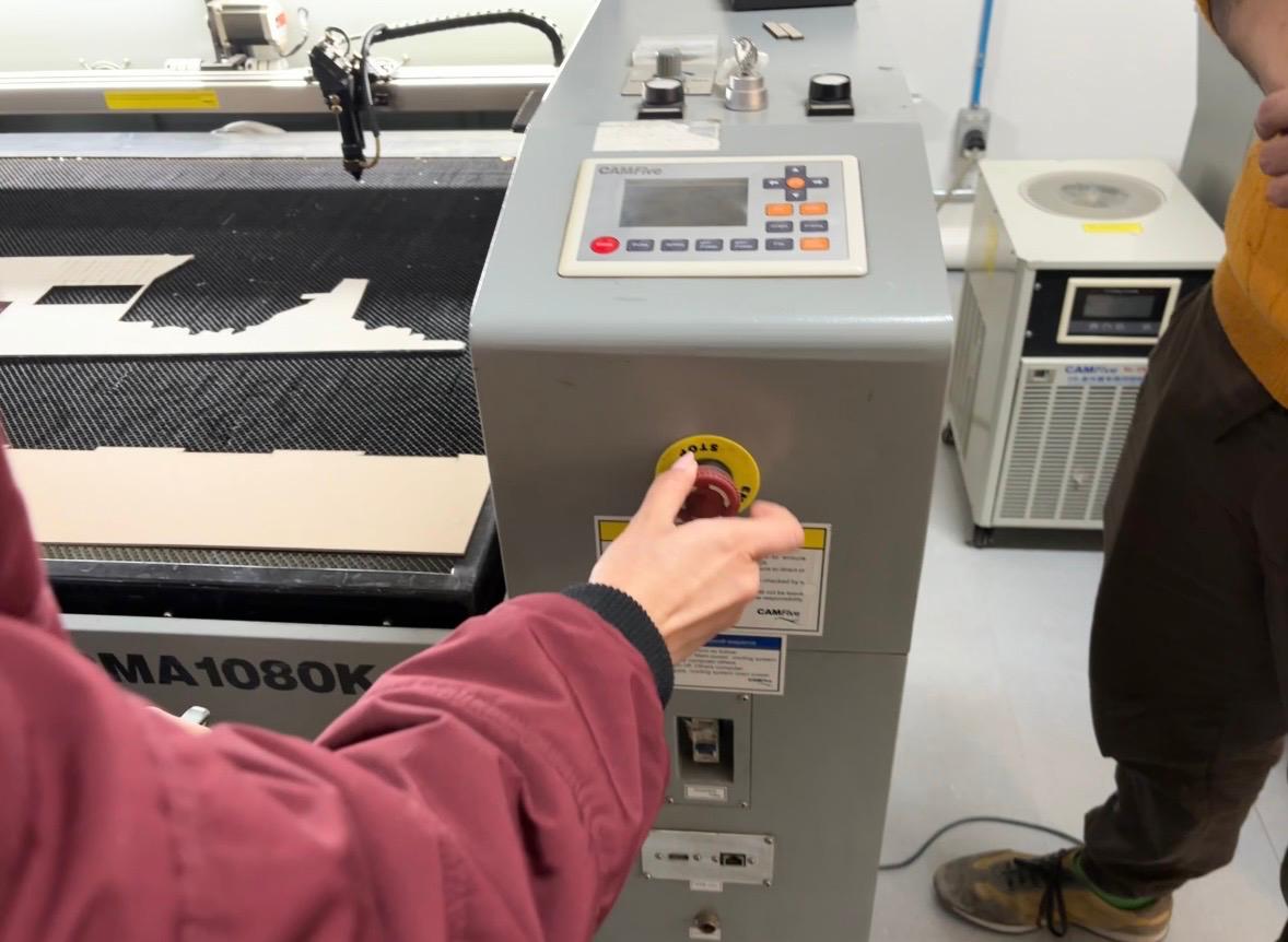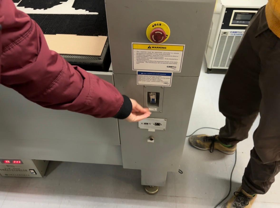 - To turn off the machine, reduce the laser power (ensuring the laser is off) and remove the safety key. Finally, return the emergency stop button to its original position, turn off the switch located at the bottom, and then turn off the main switch.
