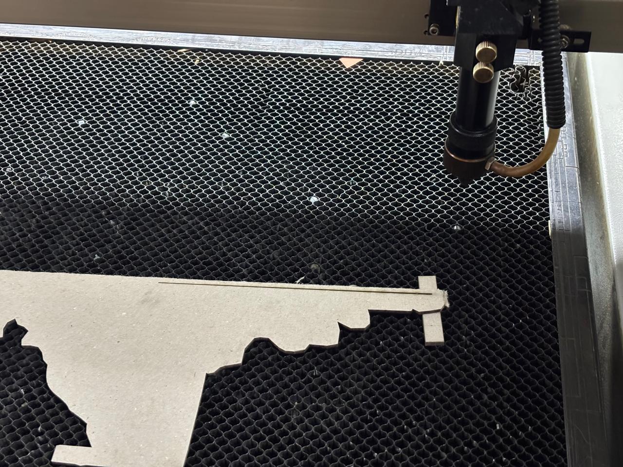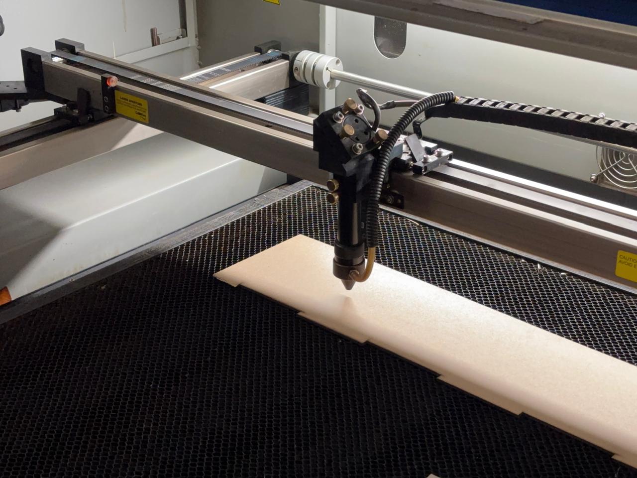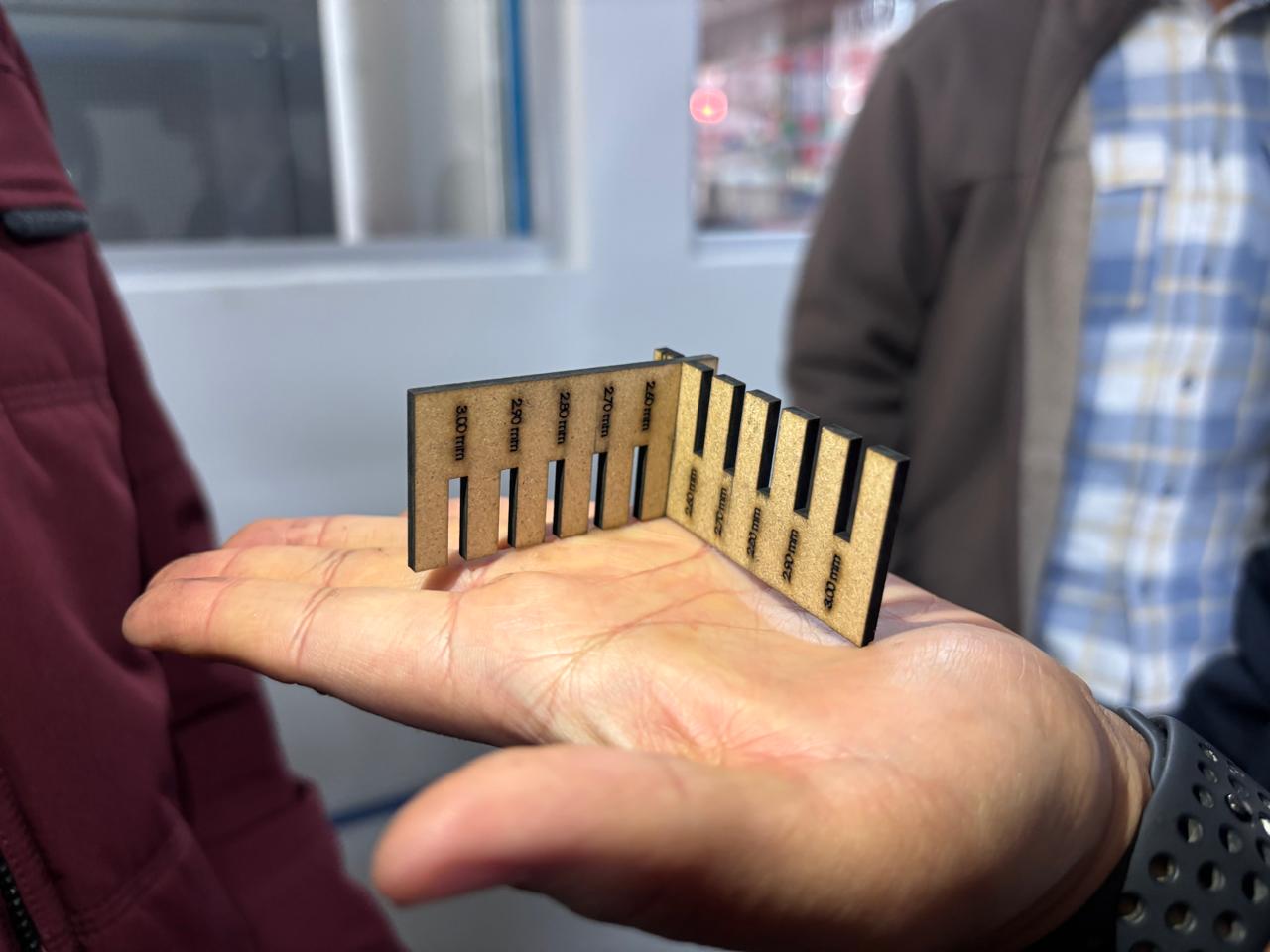 To figure out the kerf of our machine we make 10 rectangles together for the machine to cut it off in 2.5 mm wide MDF, in that way by trying by putting the rectangles back together and measuring with a caliper the distance between the joined rectangles and the cutting edge, we were able to determine the kerf, by dividing the gap by the number of cuts.