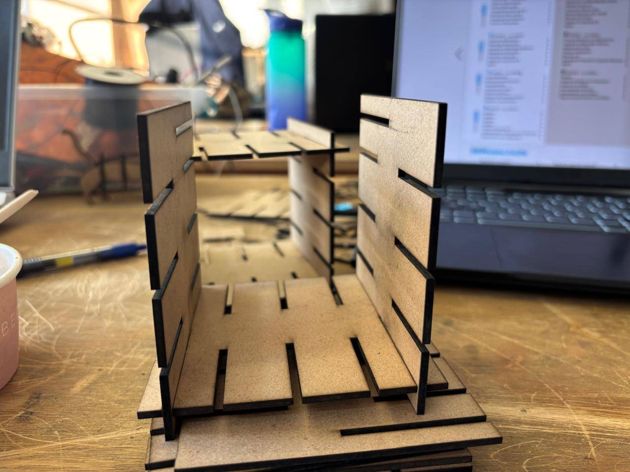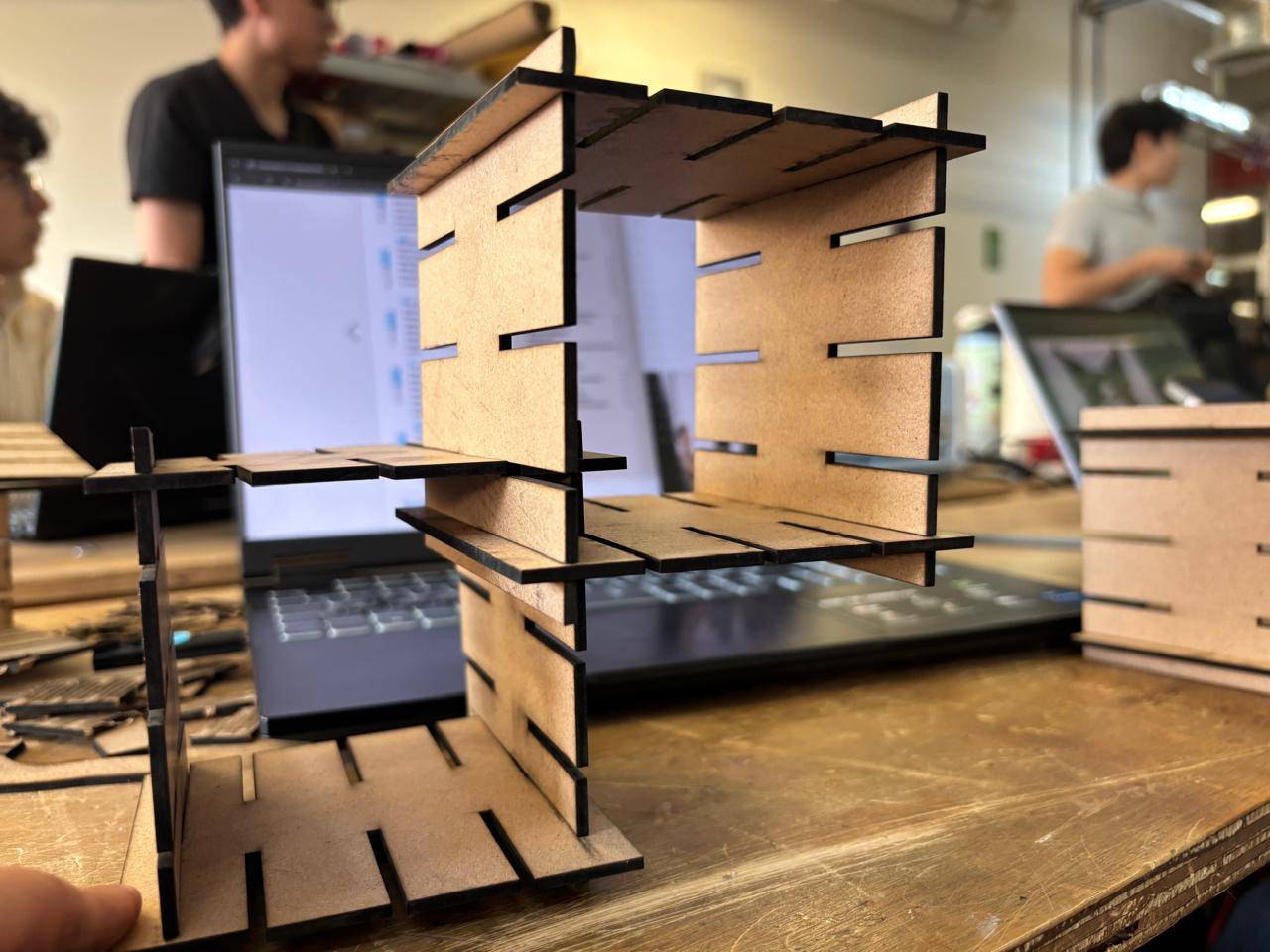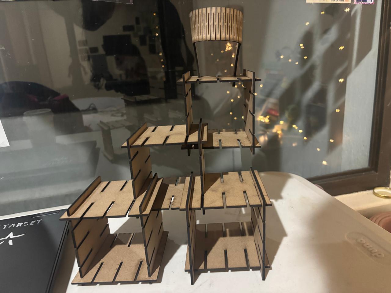 Kerf refers to the width of the slot generated by the laser cut. There are several techniques to calculate it. In this case, test cuts were performed, and based on the measured distance between the spacing left in the cut and the number of cuts made, a kerf value was obtained. This value was then used to design the square shelf structure.
