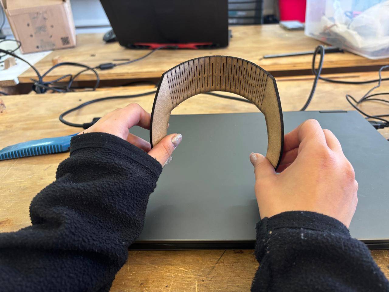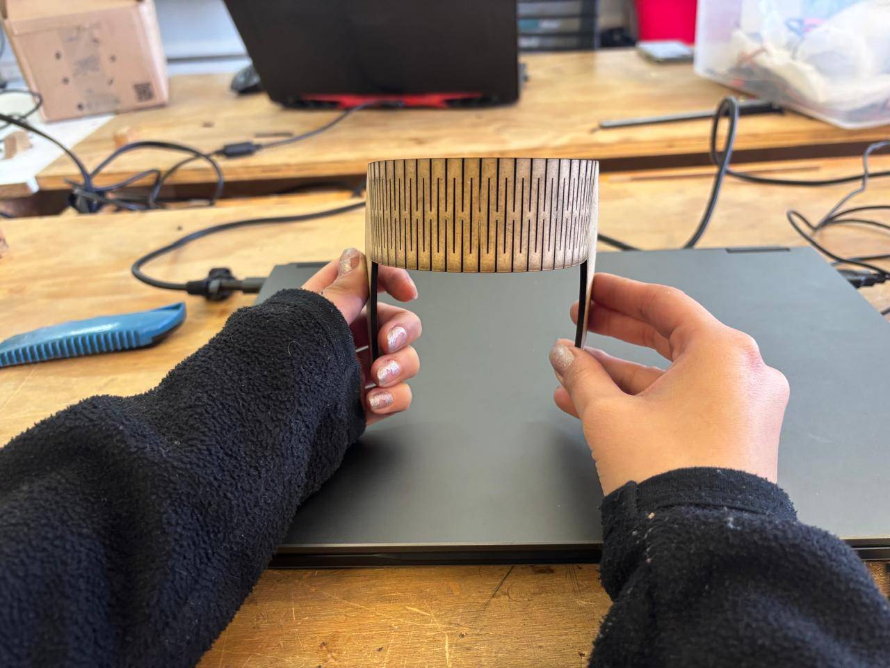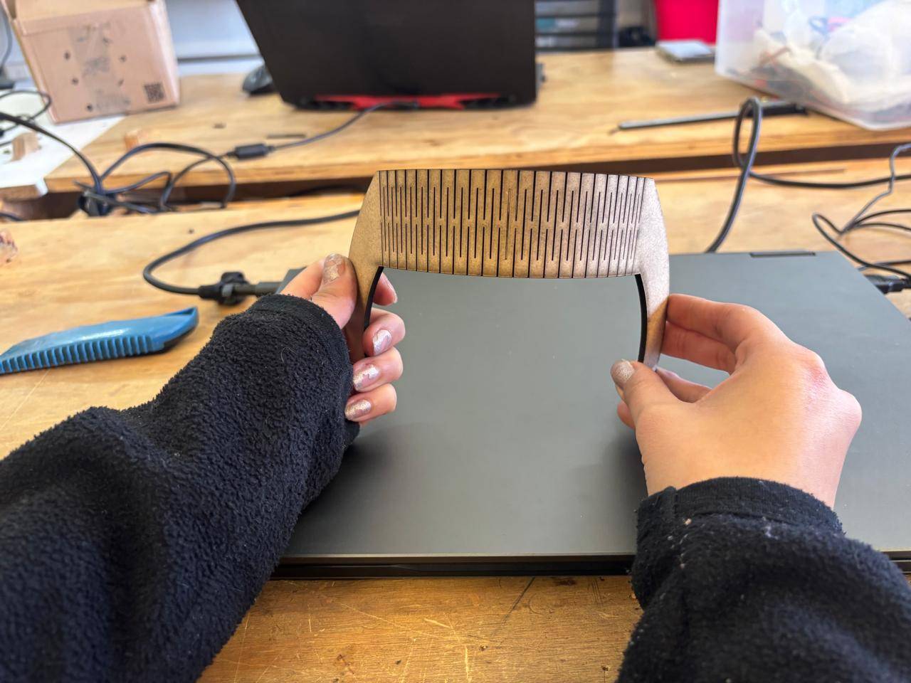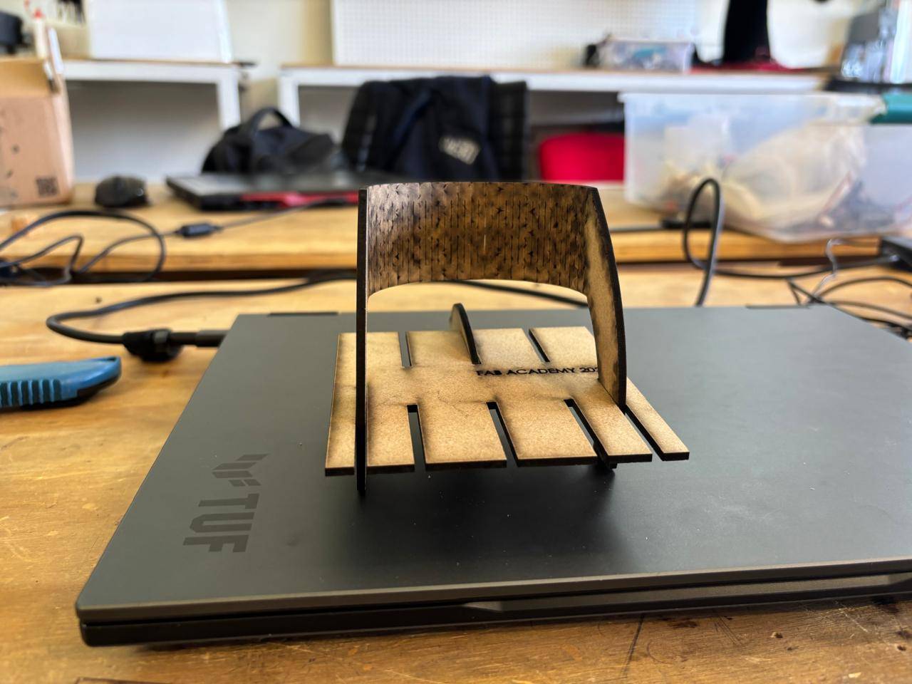 Kerf refers to the width of the slot generated by the laser cut. There are several techniques to calculate it. In this case, test cuts were performed, and based on the measured distance between the spacing left in the cut and the number of cuts made, a kerf value was obtained. This value was then used to design the square shelf structure.