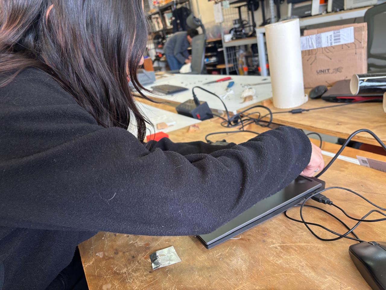 To use the laser machine, I was provided with a safety key to activate the machine and a USB drive containing the cutting software. First, I connected the machine to the power source, turned on the main switches, and disabled the emergency stop.