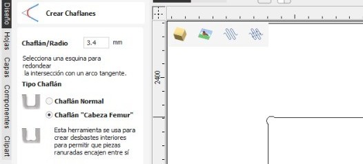 - As a recommendation, I created chamfers in areas where the machine needed to perform 90° cuts. This helps reduce machining difficulty and minimizes potential cutting errors when using the router. For the chamfers, I used a 3.4 mm value and selected a “dog-bone chamfer,” which allows the creation of internal reliefs so that slotted parts can properly fit together.