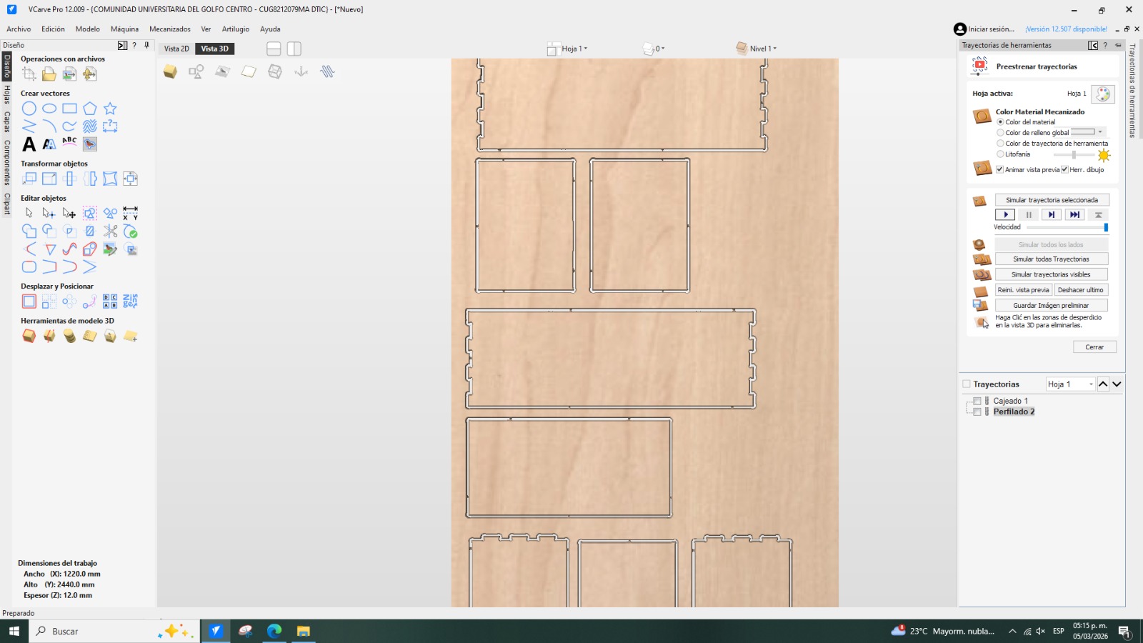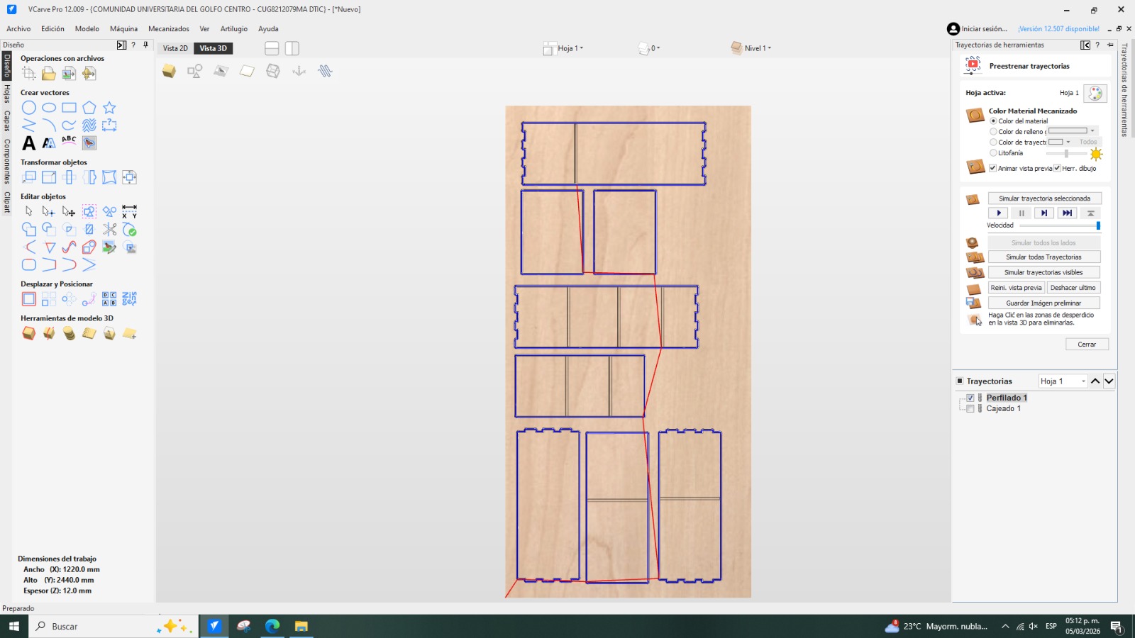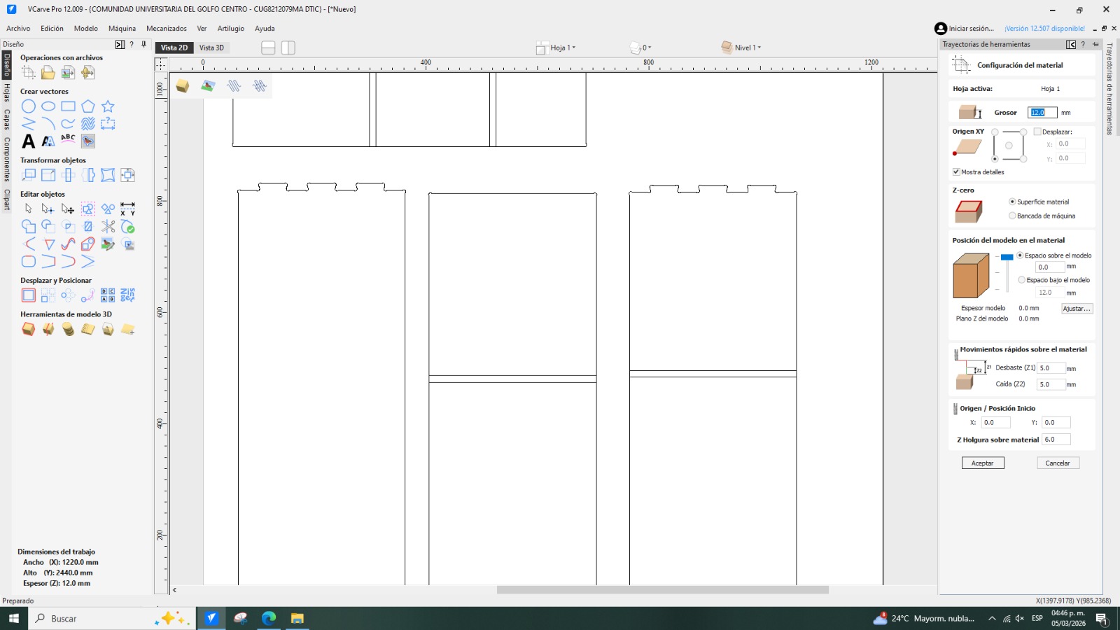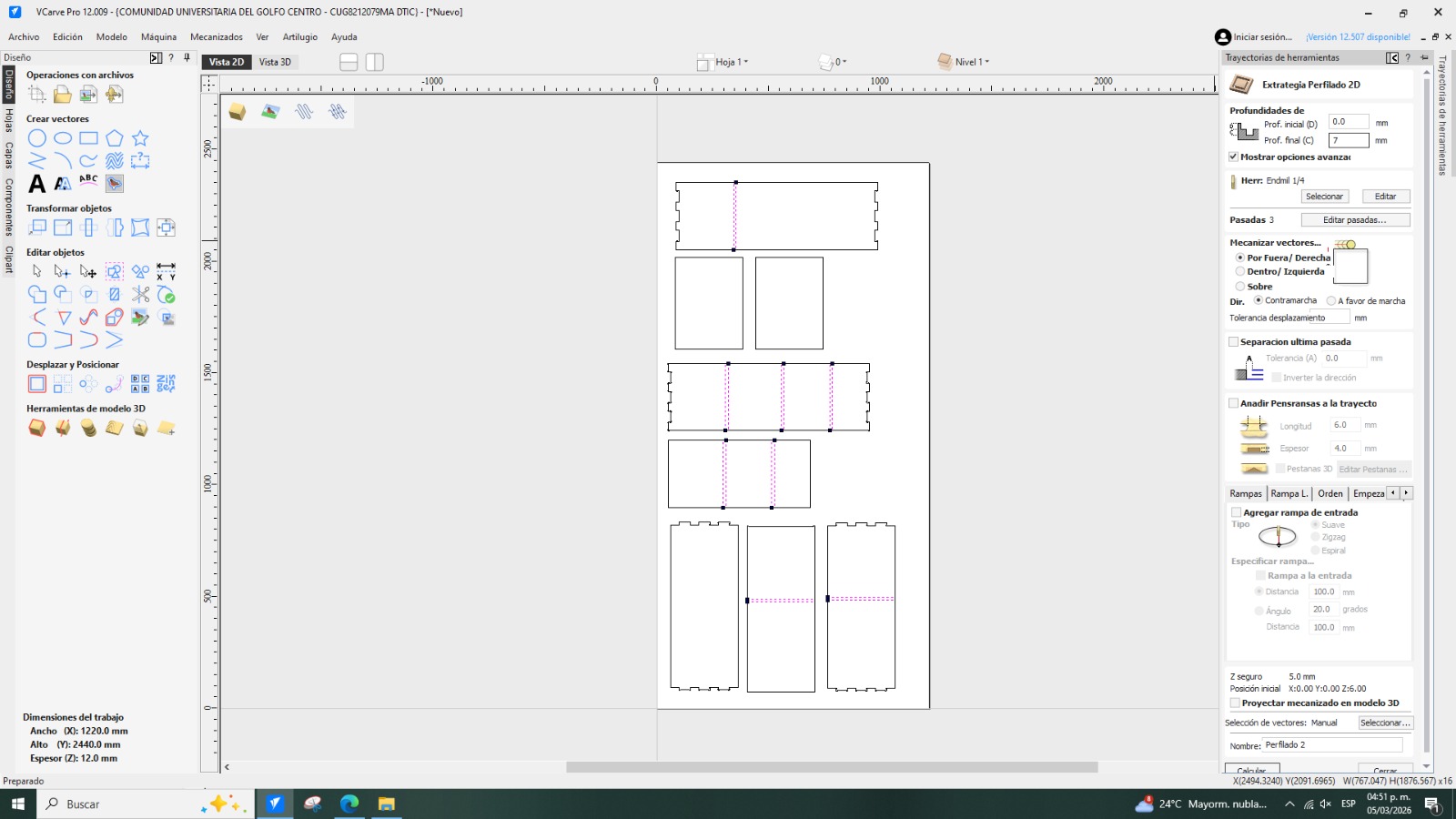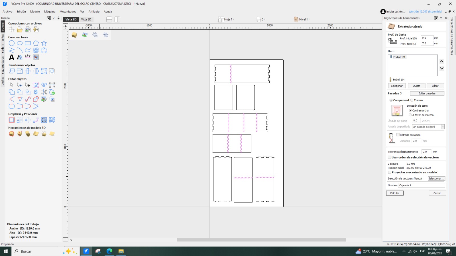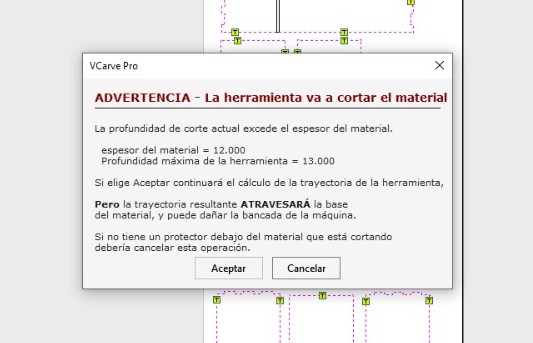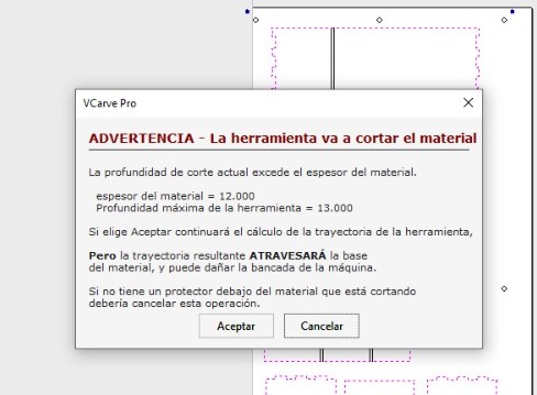 - Once these parameters were assigned, the number of passes was five, with the toolpath set outside the vectors and a cut depth of 13 mm. A warning message appeared indicating that the cutting depth exceeded the material thickness; however, in my case I accepted it.