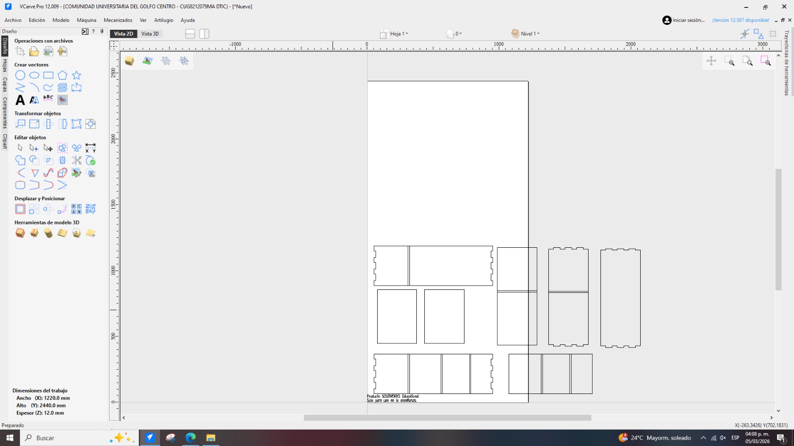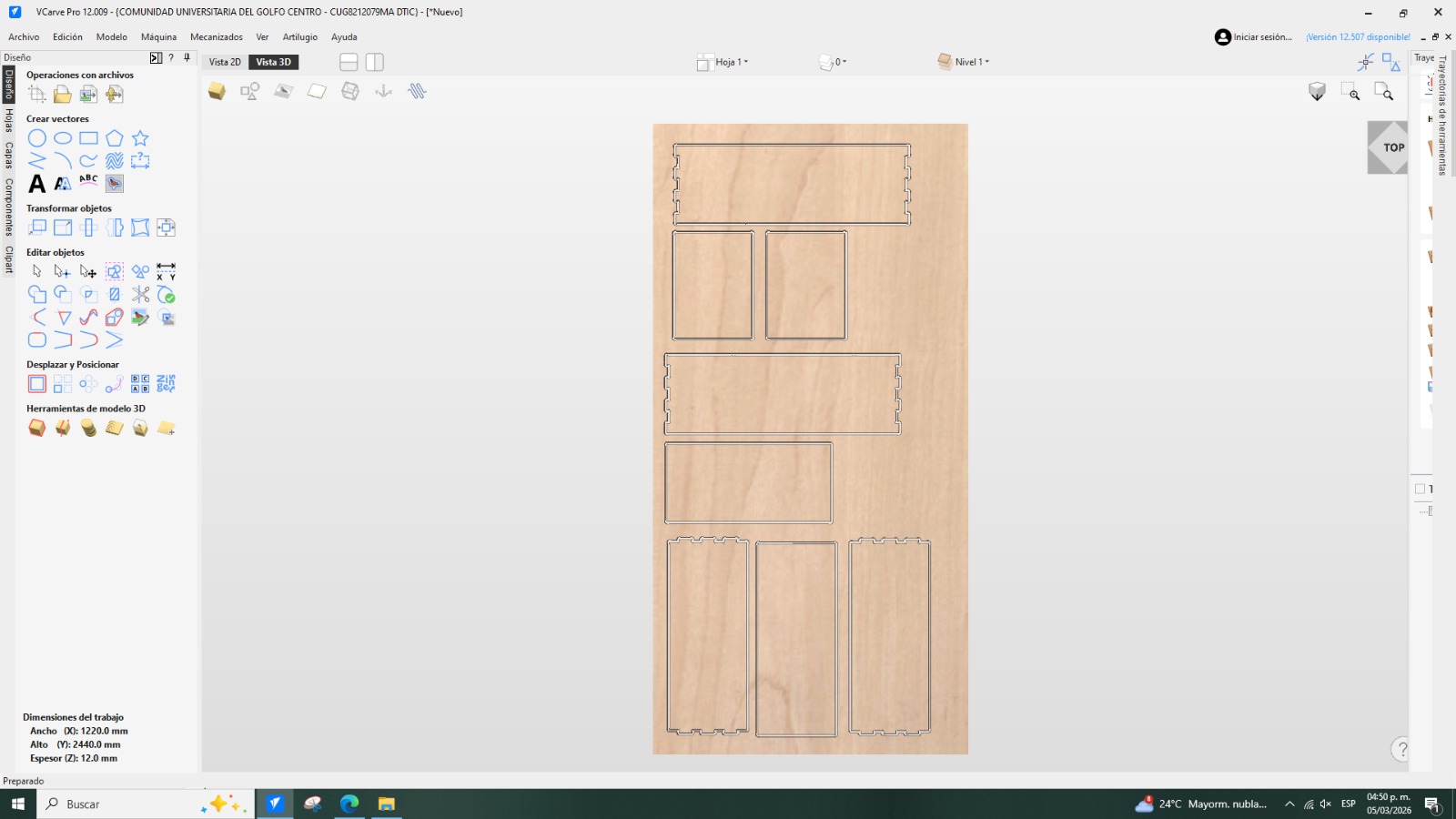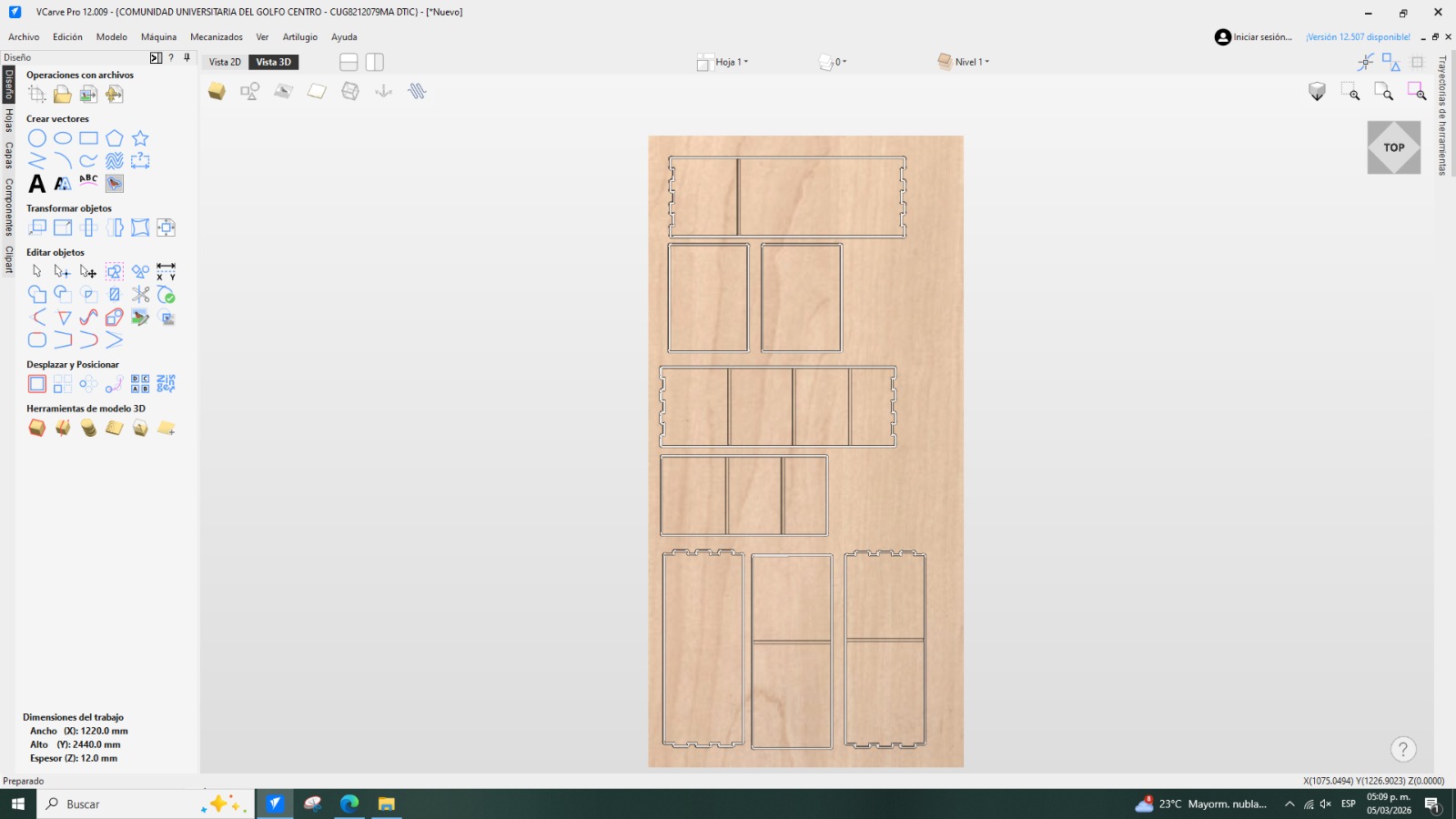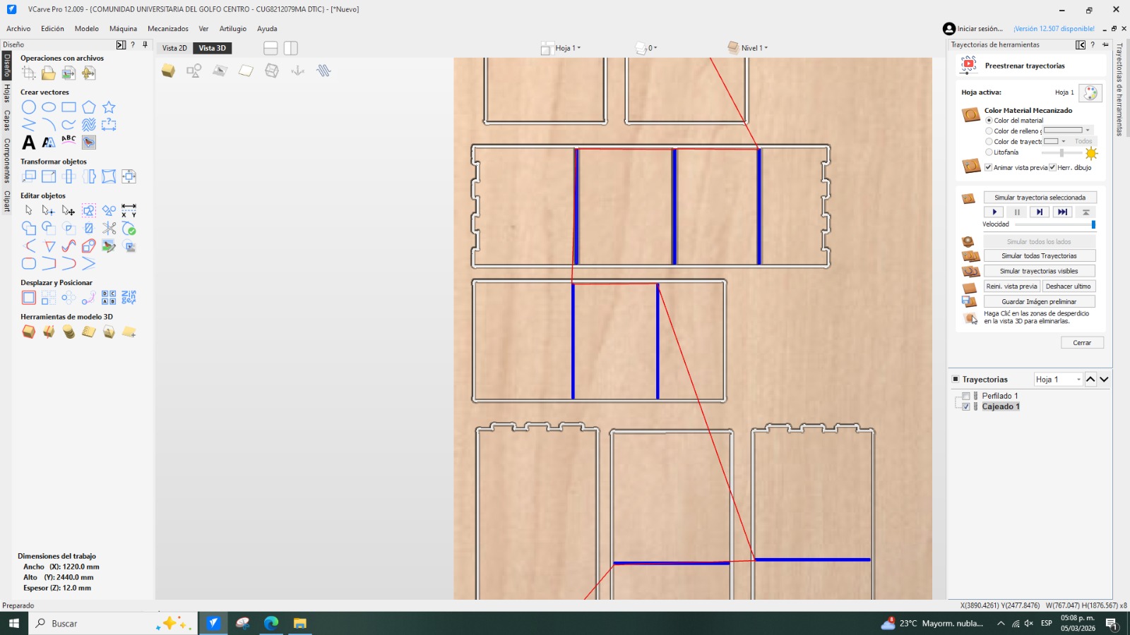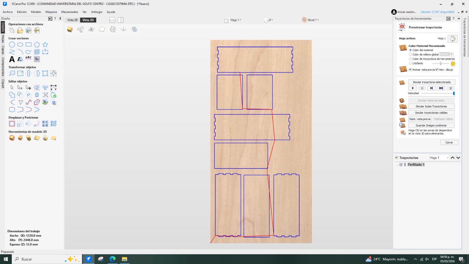 - Once these parameters were assigned, the number of passes was five, with the toolpath set outside the vectors and a cut depth of 13 mm. A warning message appeared indicating that the cutting depth exceeded the material thickness; however, in my case I accepted it.