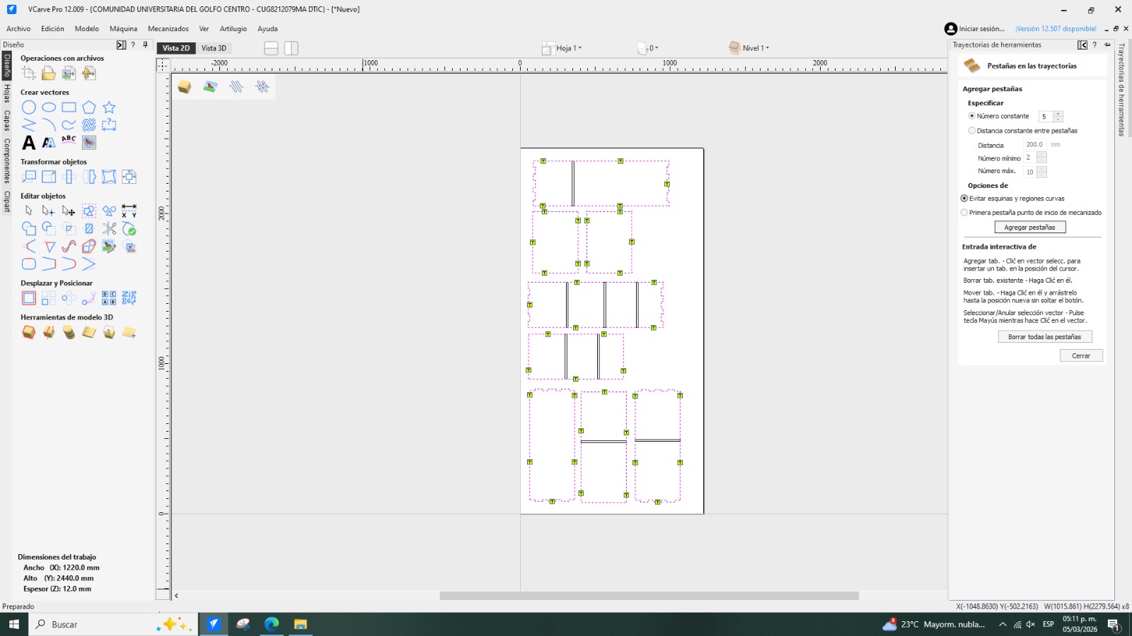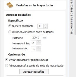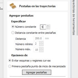 - I also added tabs along the toolpaths to prevent the pieces from moving or jumping during the cutting process. I placed five tabs along the vectors.