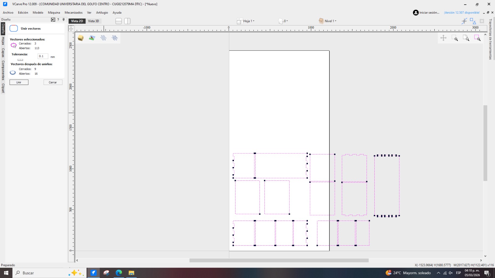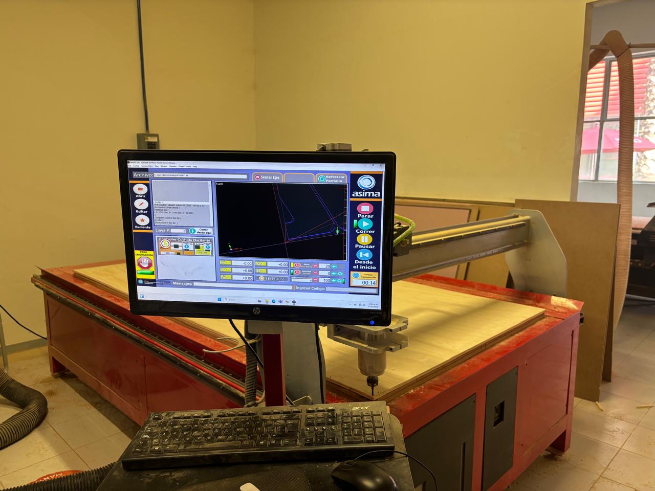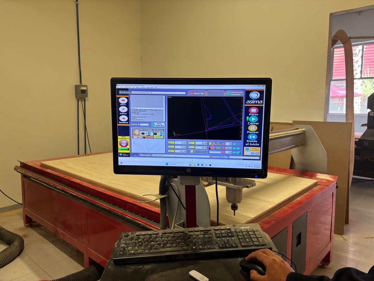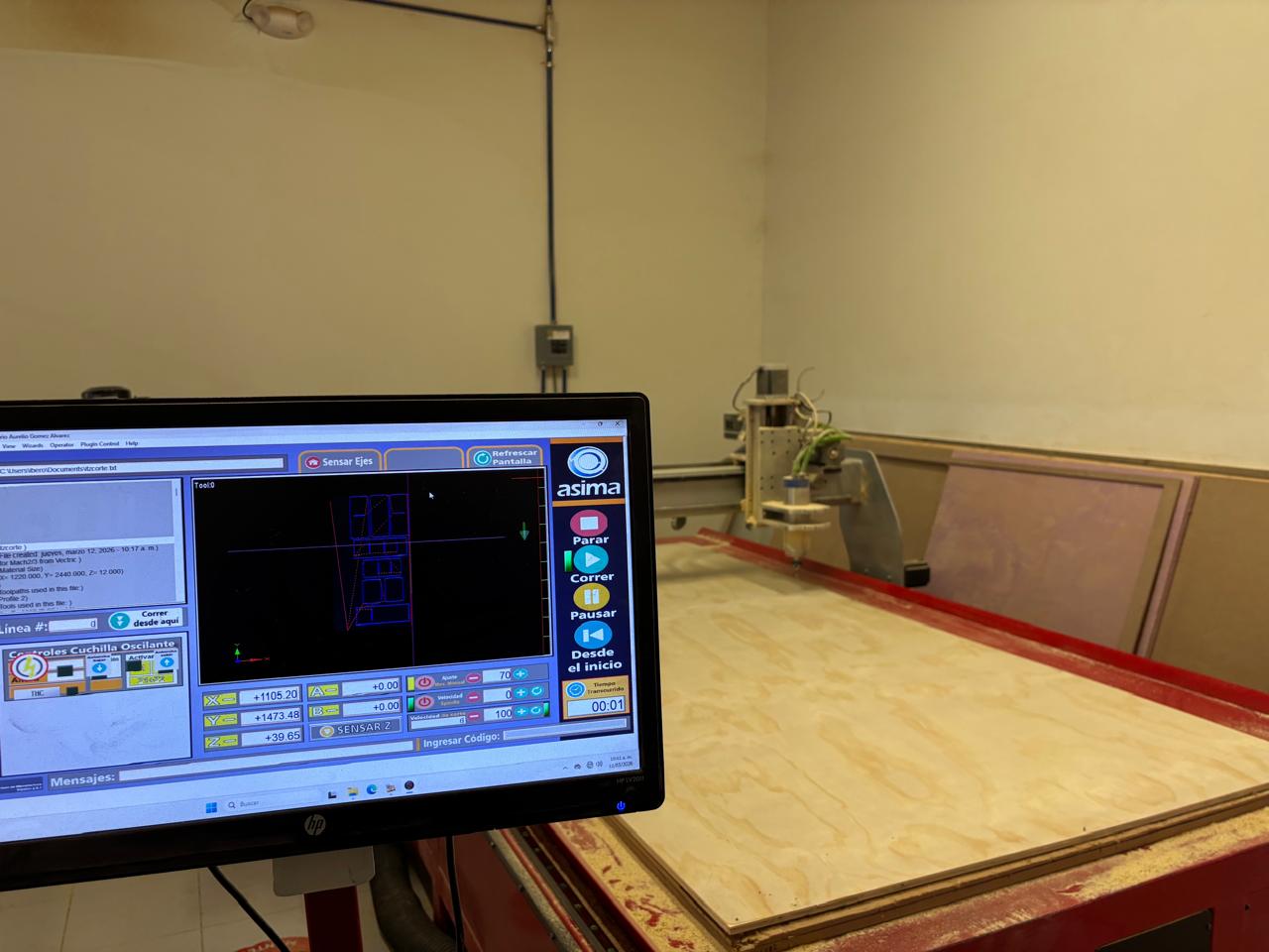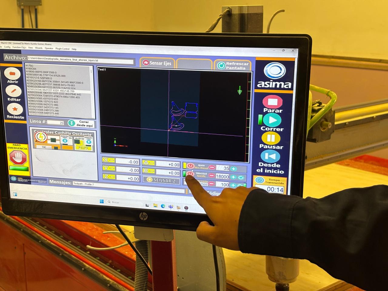 The origin is set by moving the tool axis to the corner of the material, and the tool speed is assigned. Finally, the ASIMA program is opened on the computer, where the .txt file is opened. Then, to verify that the tool does not pass over the screws, I moved the tool over them and compared the trajectory. Once this was verified, I started the program.