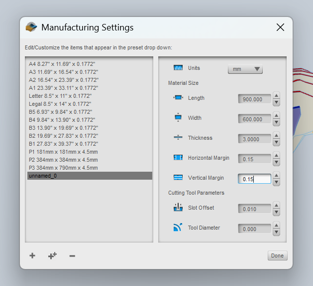 I chose the laser cutter I would use (white one in the picture) and checked the parameters according to my material (3mm MDF):