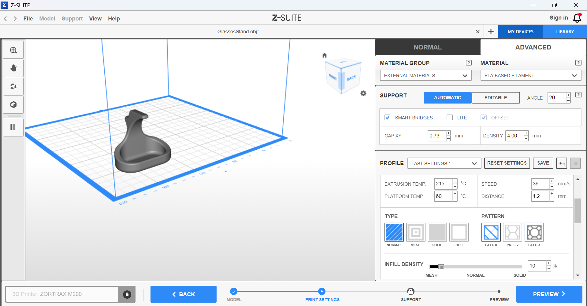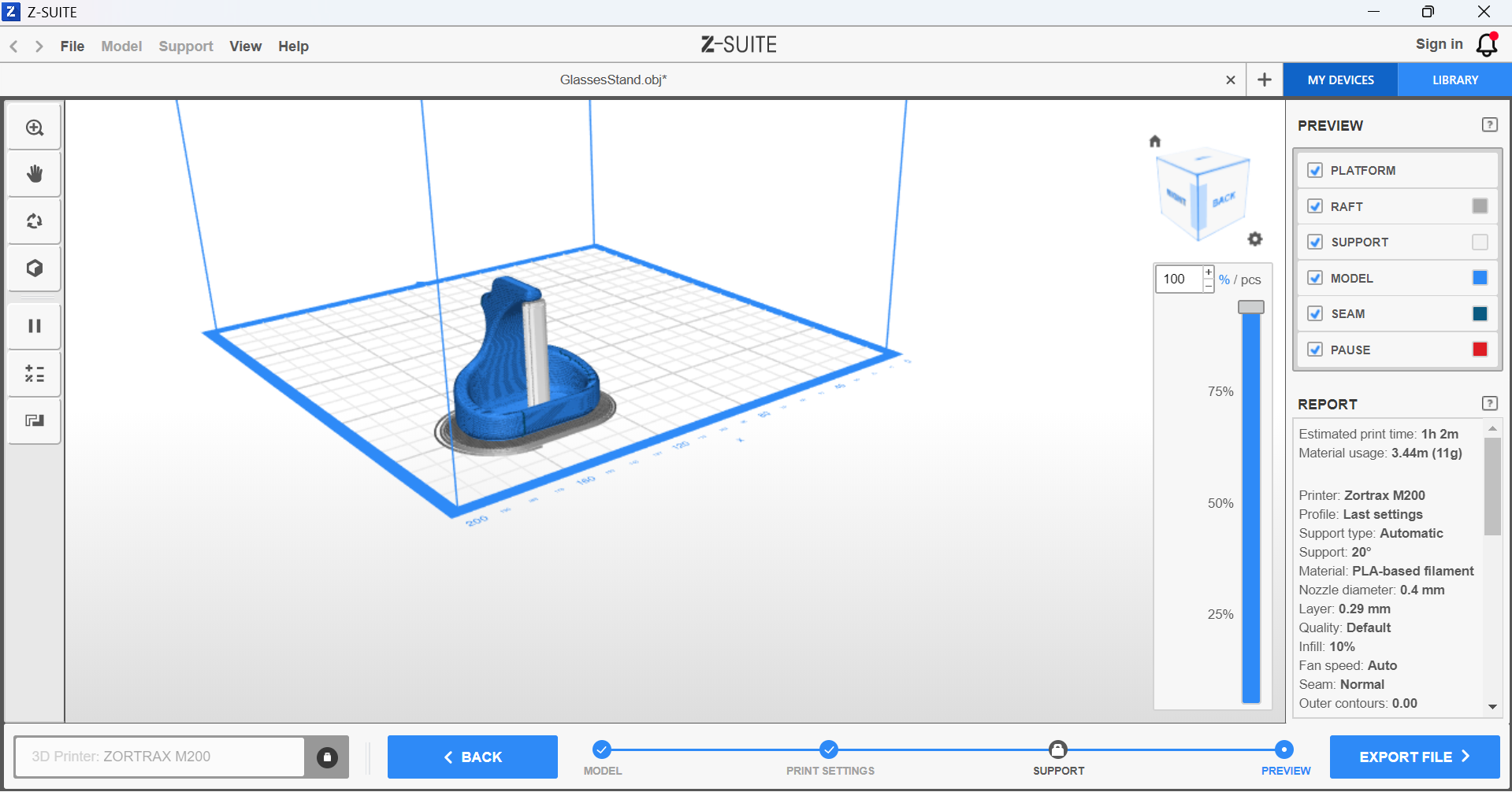 For this assignement, I found, sliced and printed a glasses holder using Z-Suite and a Zortrax M200 that was available in my local FabLab.