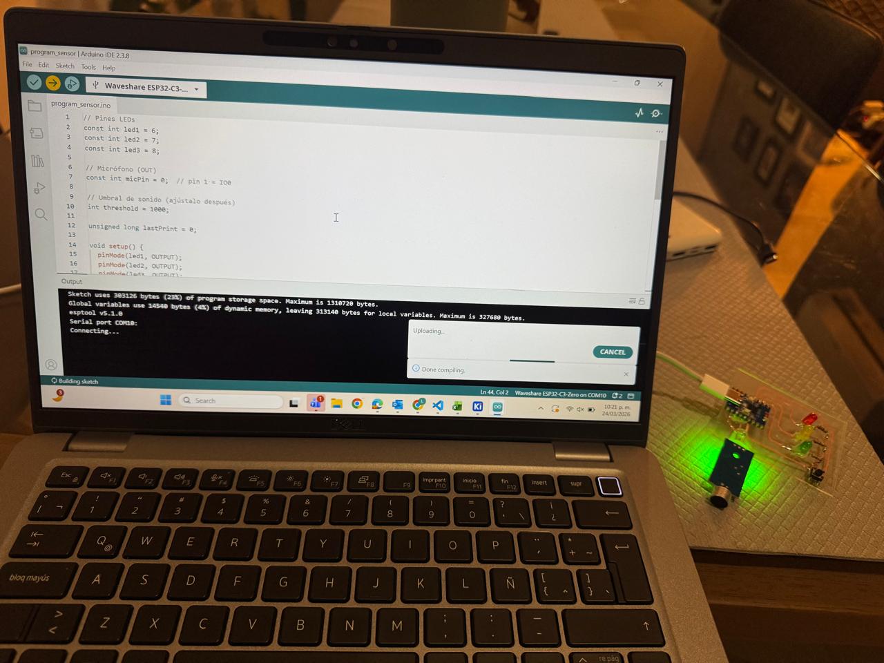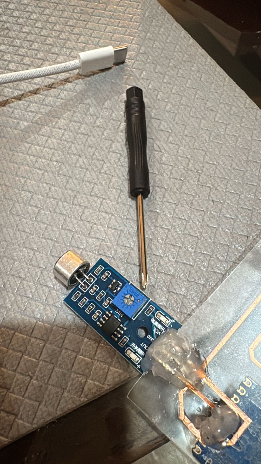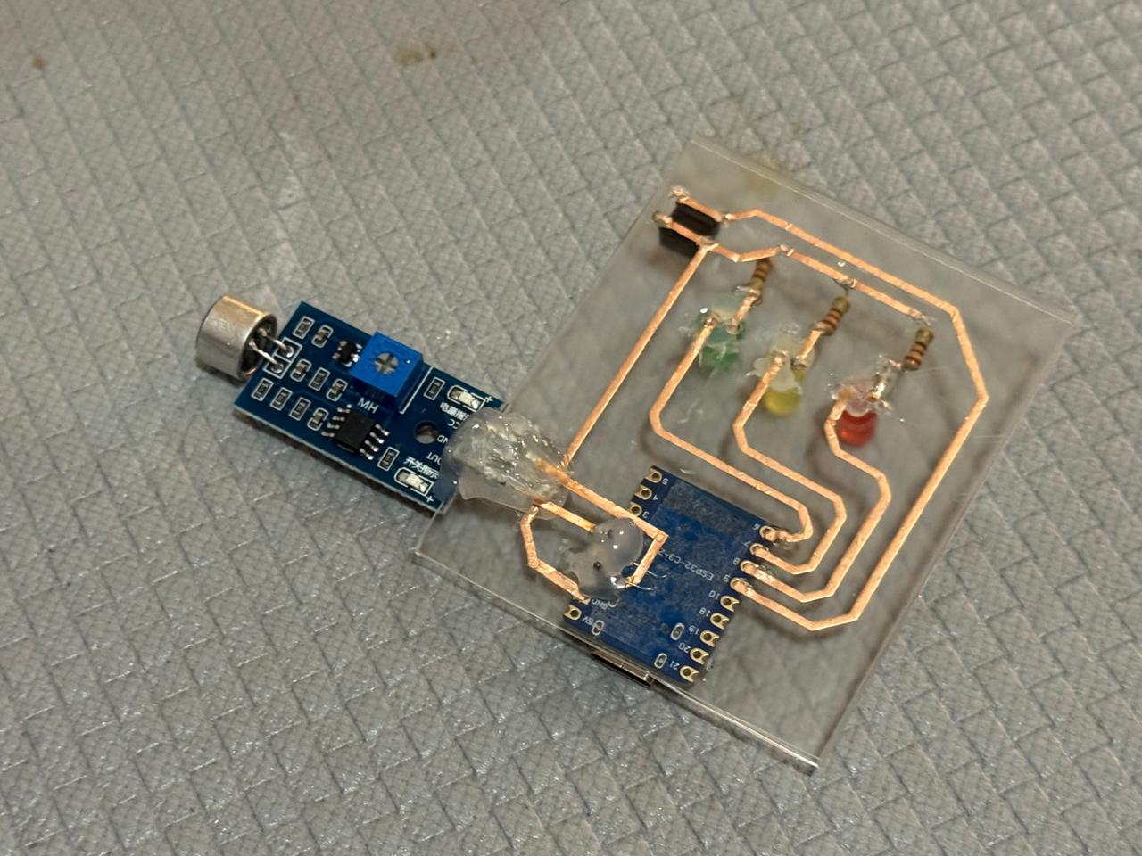 - Made the holes I needed to connect the 3 pins of my microphone sensor: OUT, GND and V. Thinking it shouldn't be too complicated, fully trusting my soldering skills and my vision.