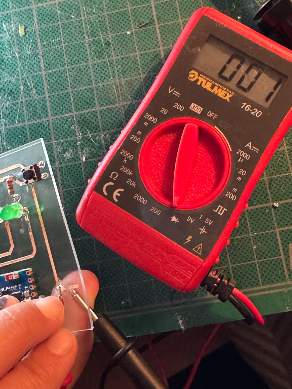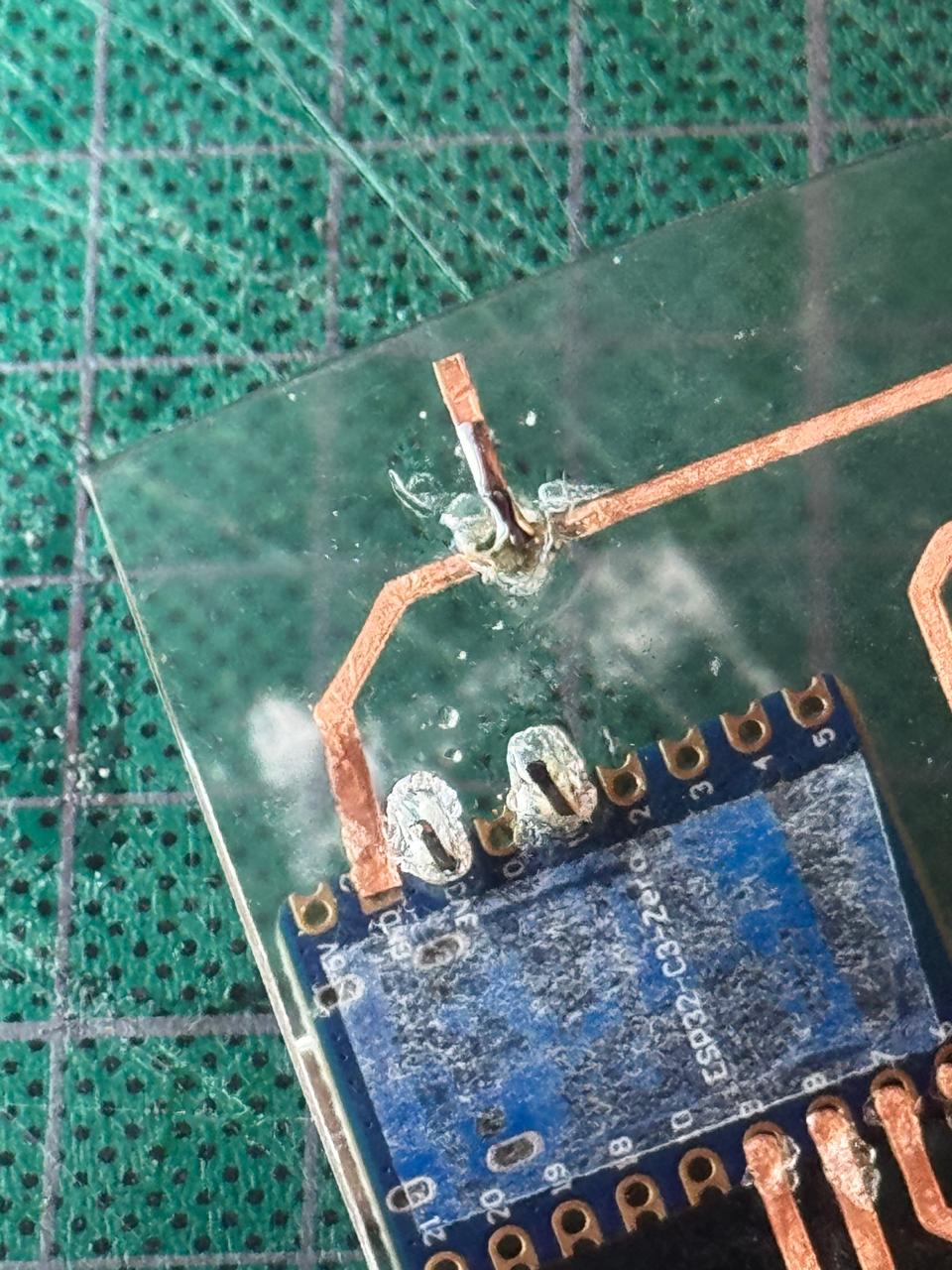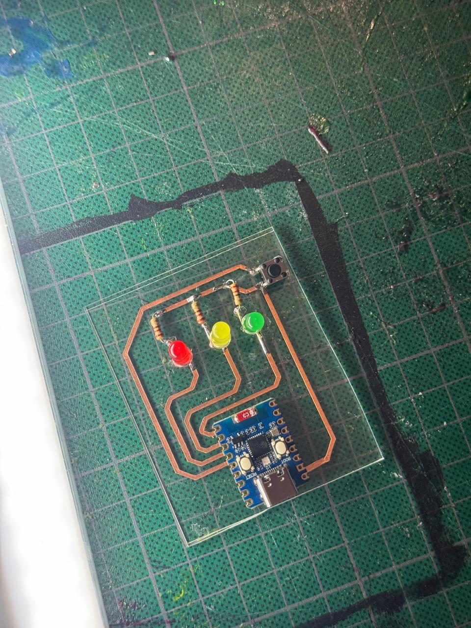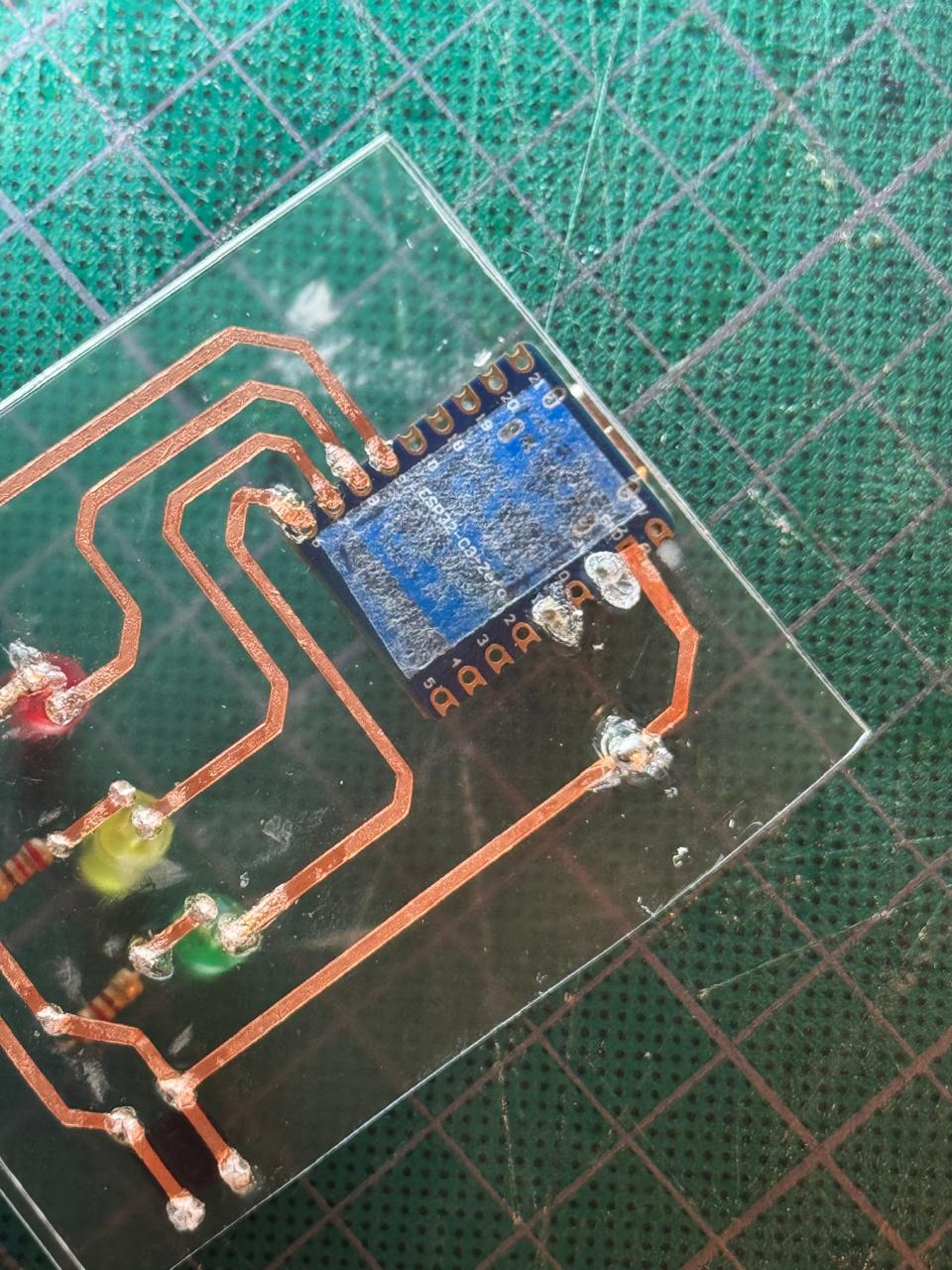 - Added some single pins and copper tape from last week's spare cut manually to create my tracks. (Crossing my fingers with every move)