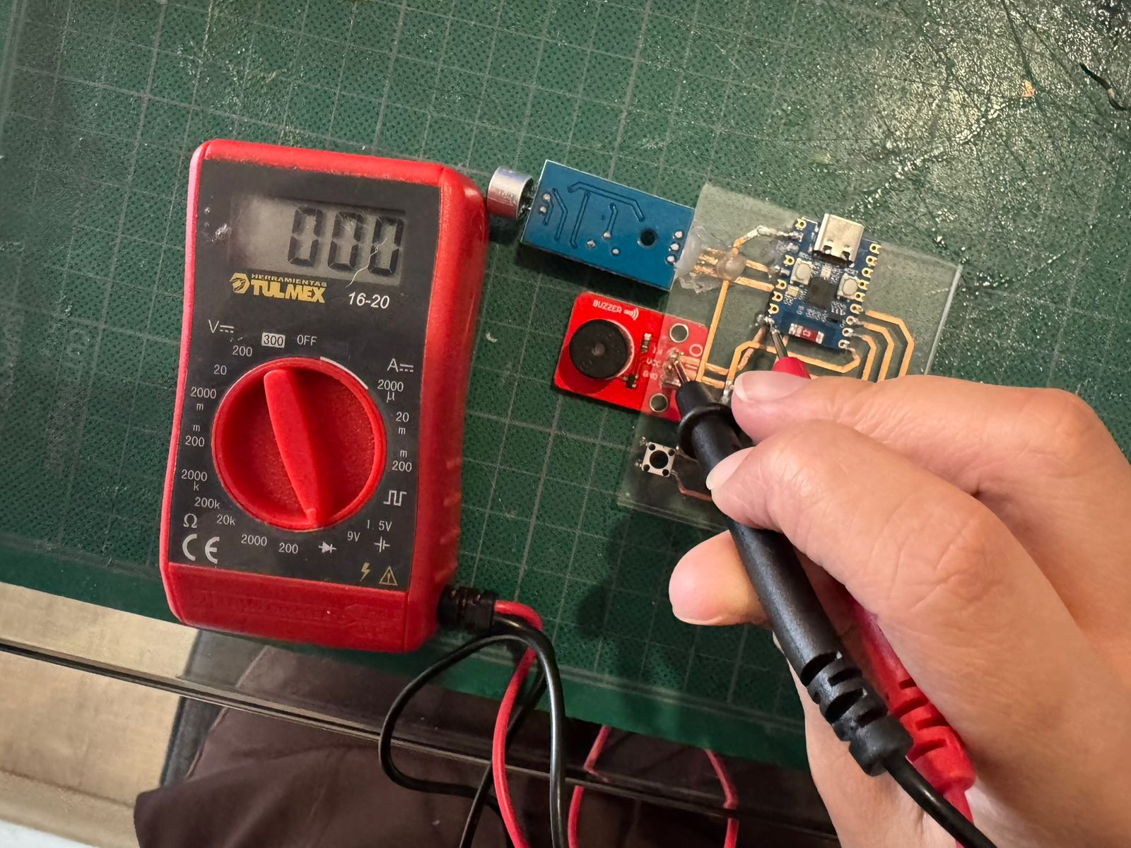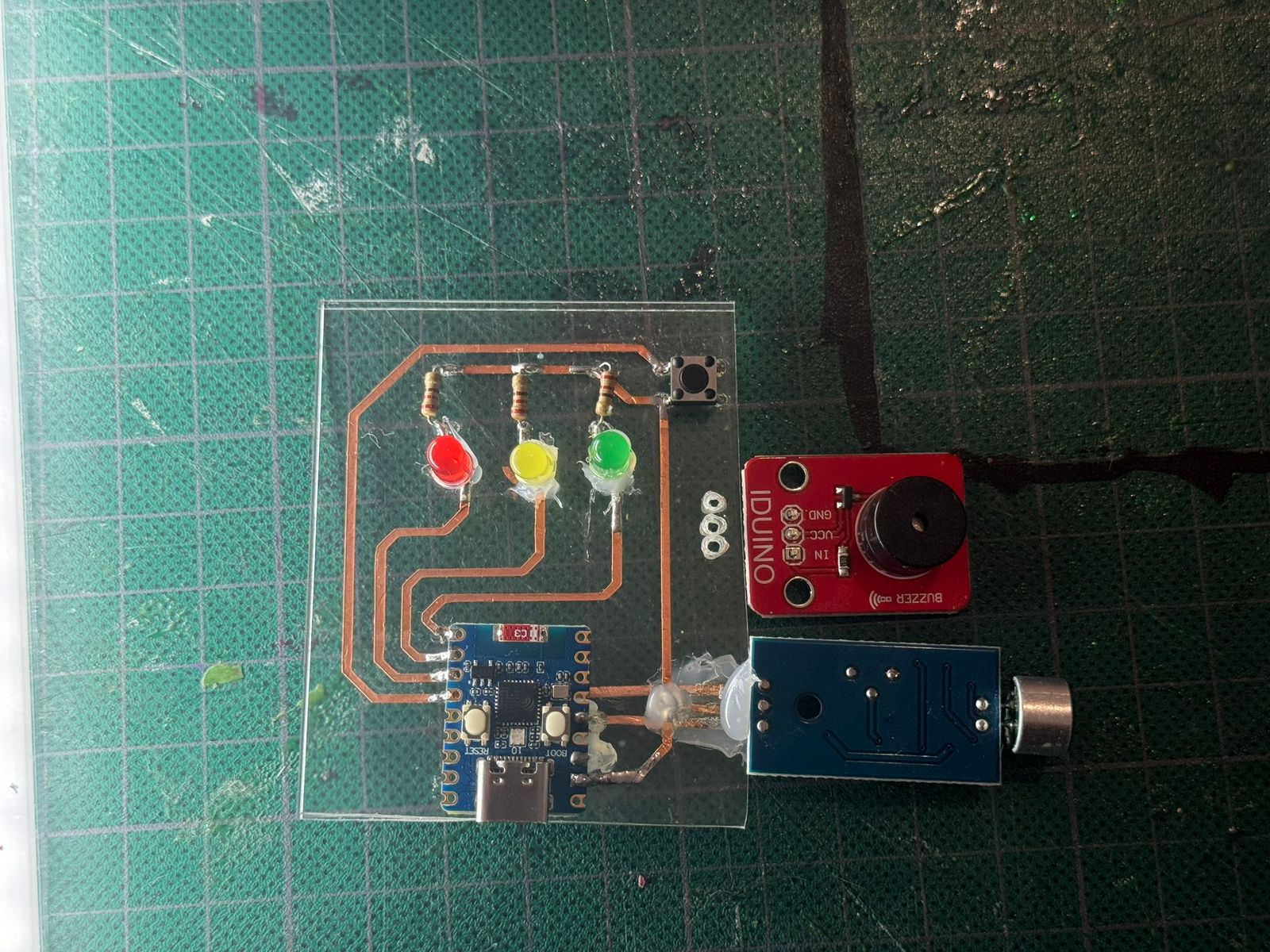 For this assignement I also decided to reuse last week's circuit. As it still had some pins available and I saw the opportunity to use them. I just had to make some more holes in my acrilic, making sure they where on the right positions for the buzzer I was about to add: