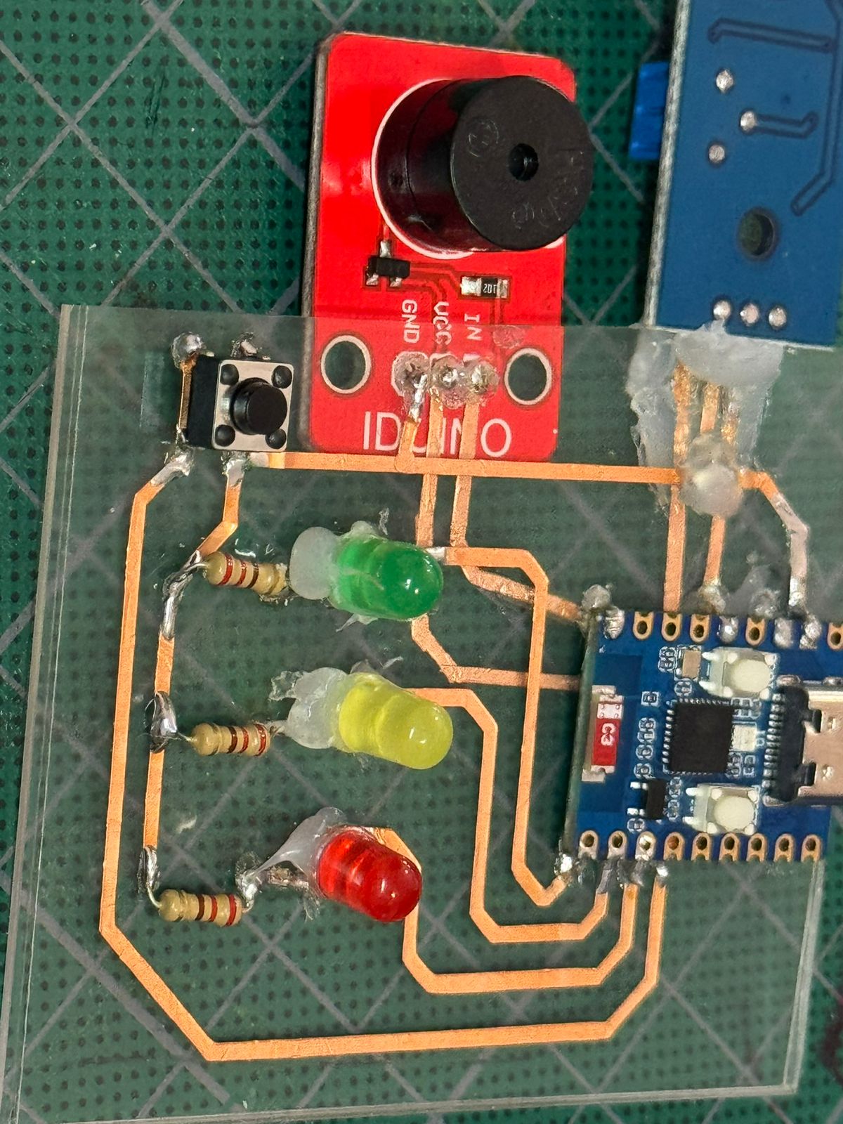 Then all tracks had to be placed and soldered with the buzzer: In to the pin (bottom layer), VCC to 3V (bottom layer), and GND to the circuit's GND.(top layer)