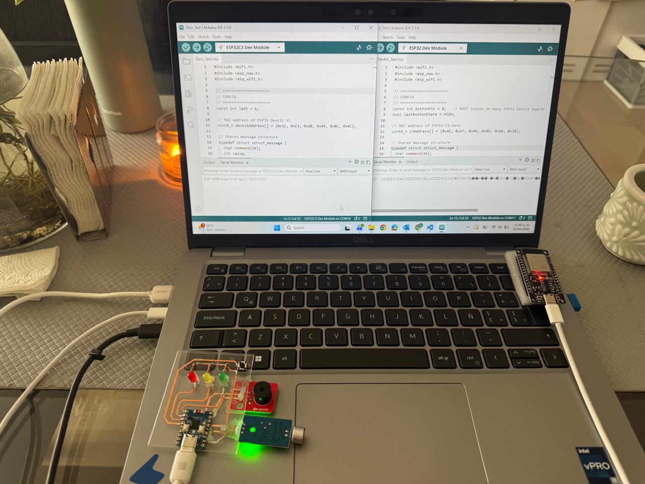 The goal: Pressing a button on the DevKit triggers the LED + buzzer pattern on the C3, while the C3 keeps reading the microphone, and the DevKit receives that signal and prints a message in Serial.