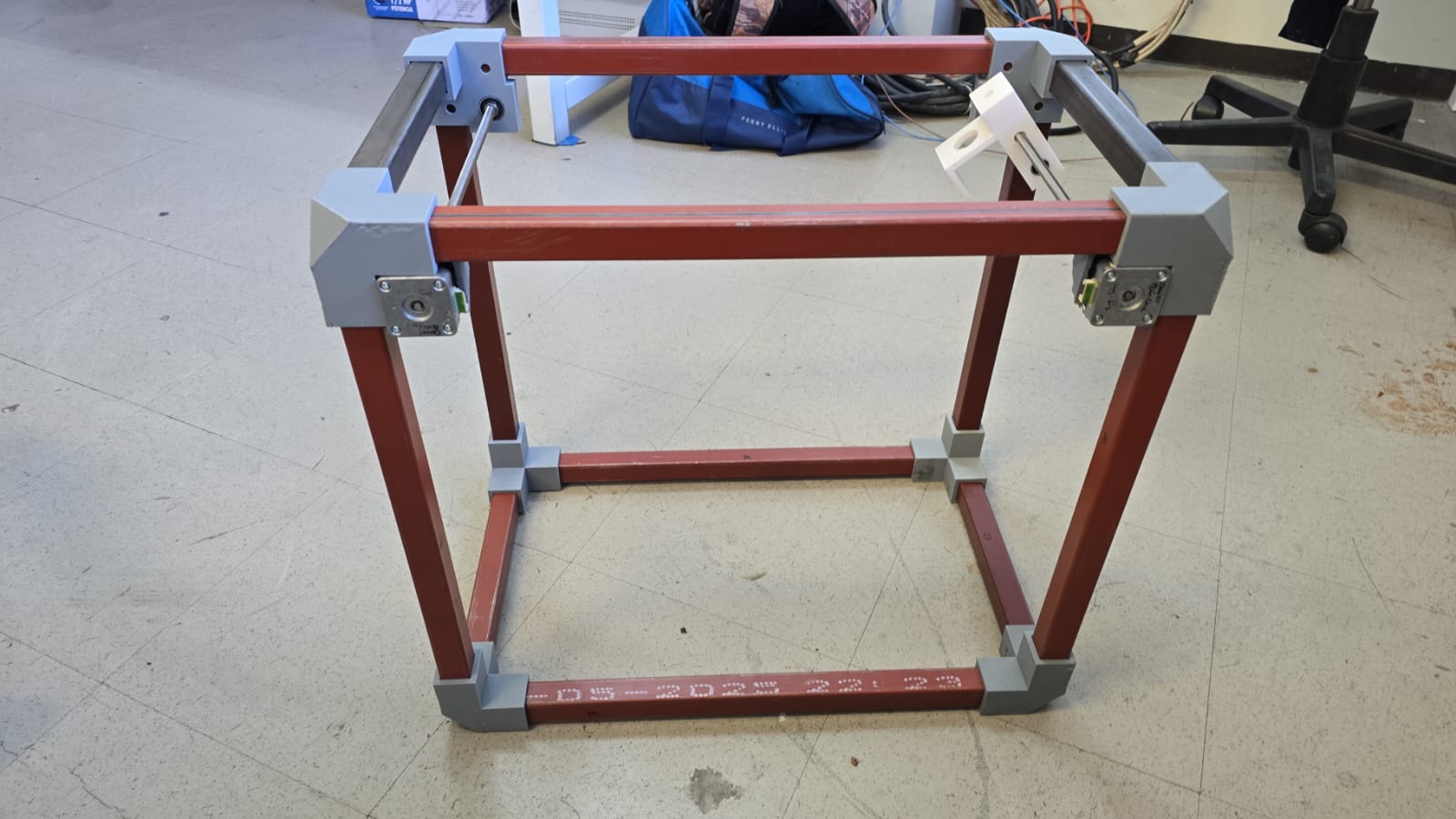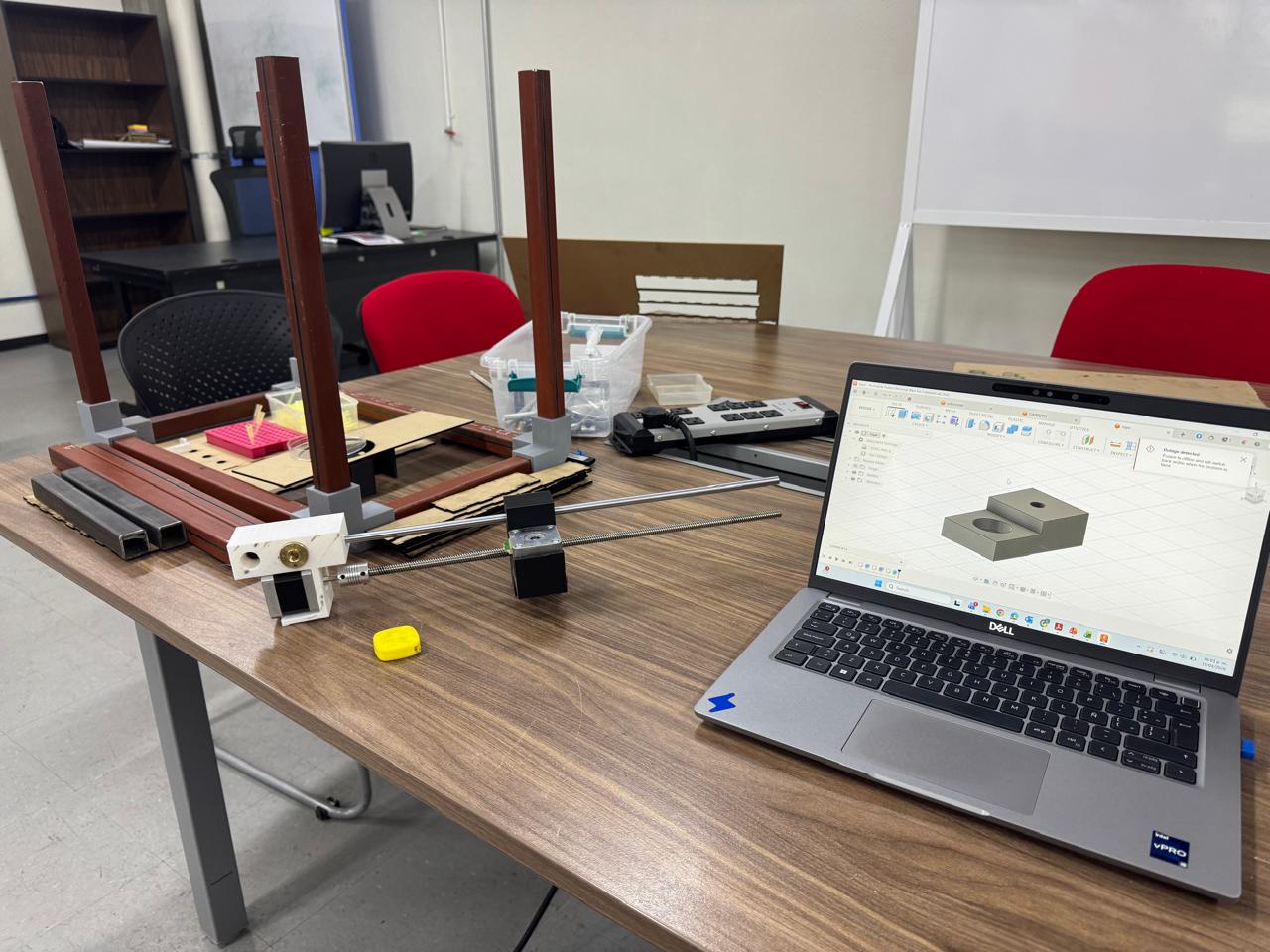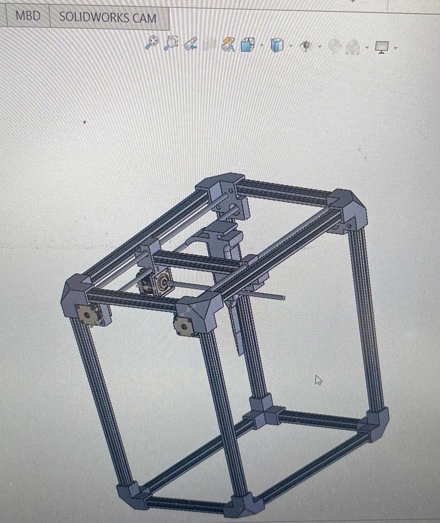 With all materials on the table and measurements noted, we created a 3D model of what we thought the machine would look like. Along with the existing materials, we started designing the missing pieces we would have to print: